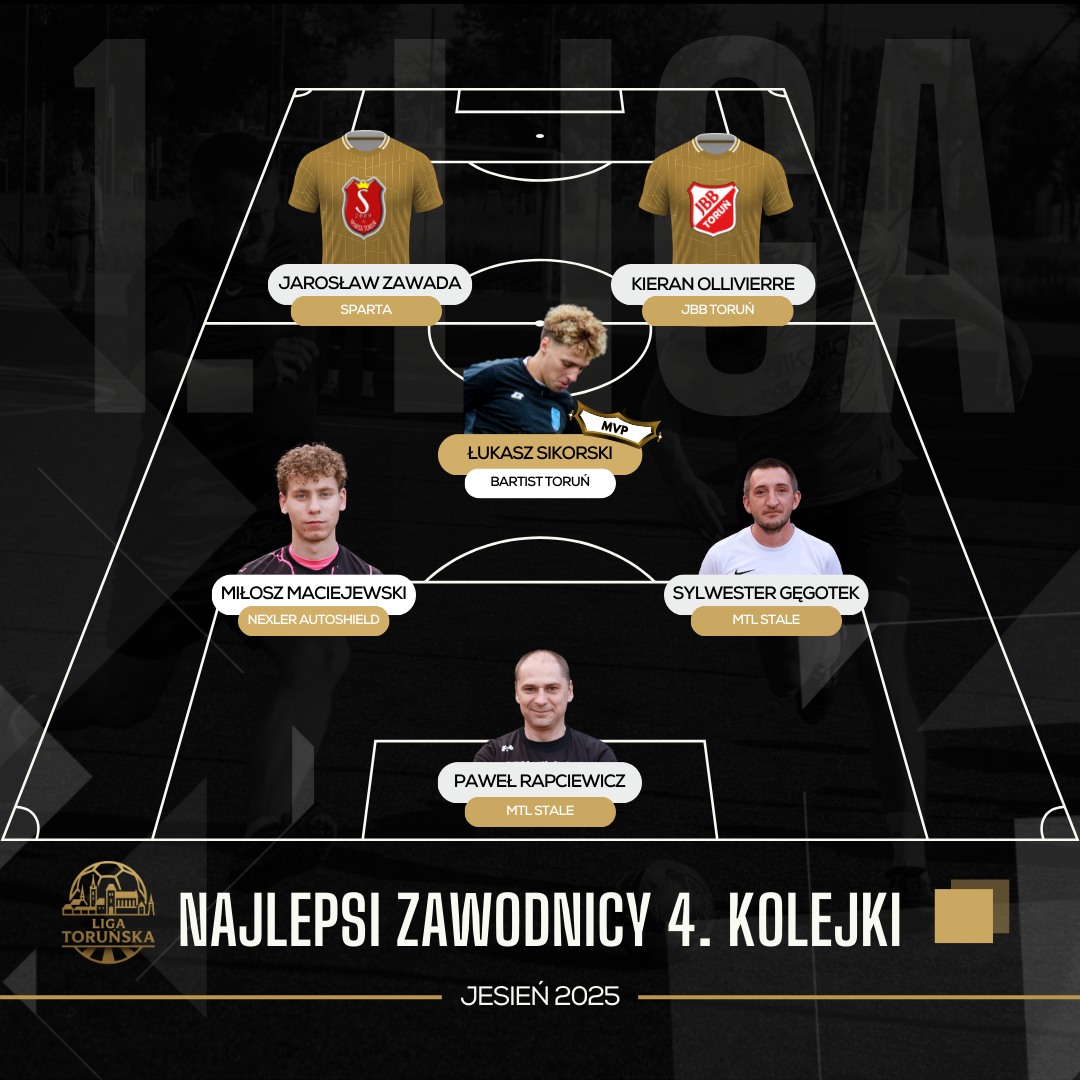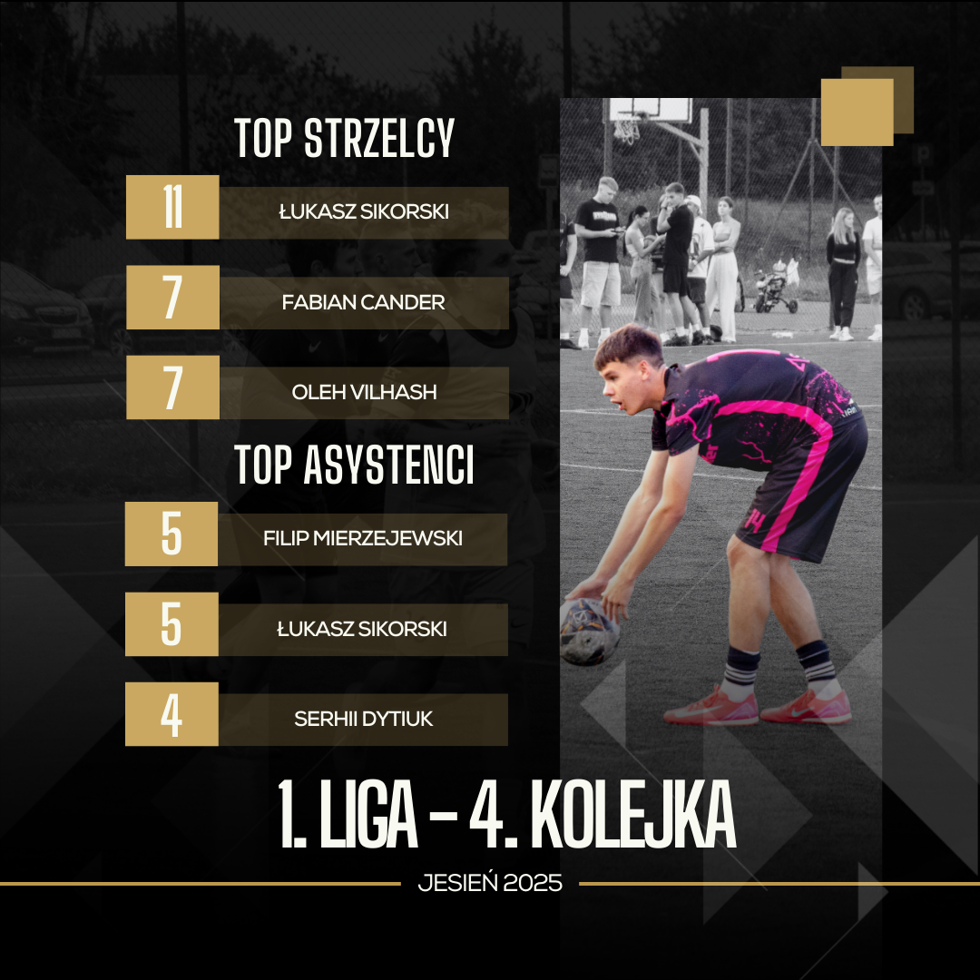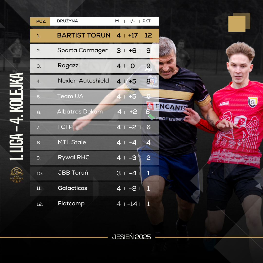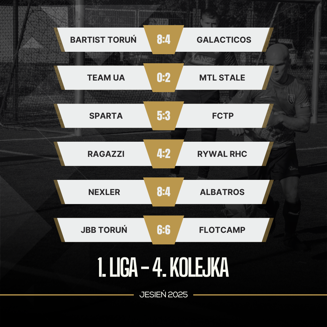 4. kolejka 1. Ligi Toruńskiej obfitowała w interesujące mecze i wiele bramek. Średnia goli na mecz wyniosła prawie 9. Tylko jeden bramkarz zachował czyste konto. Z kolei jeden z graczy ofensywnych zanotował aż 6 trafień. Kilka ekip potwierdziło swoją dobrą formę, a kilka innych po tej kolejce jeszcze mocniej osadziło się na dnie ligowej tabeli.