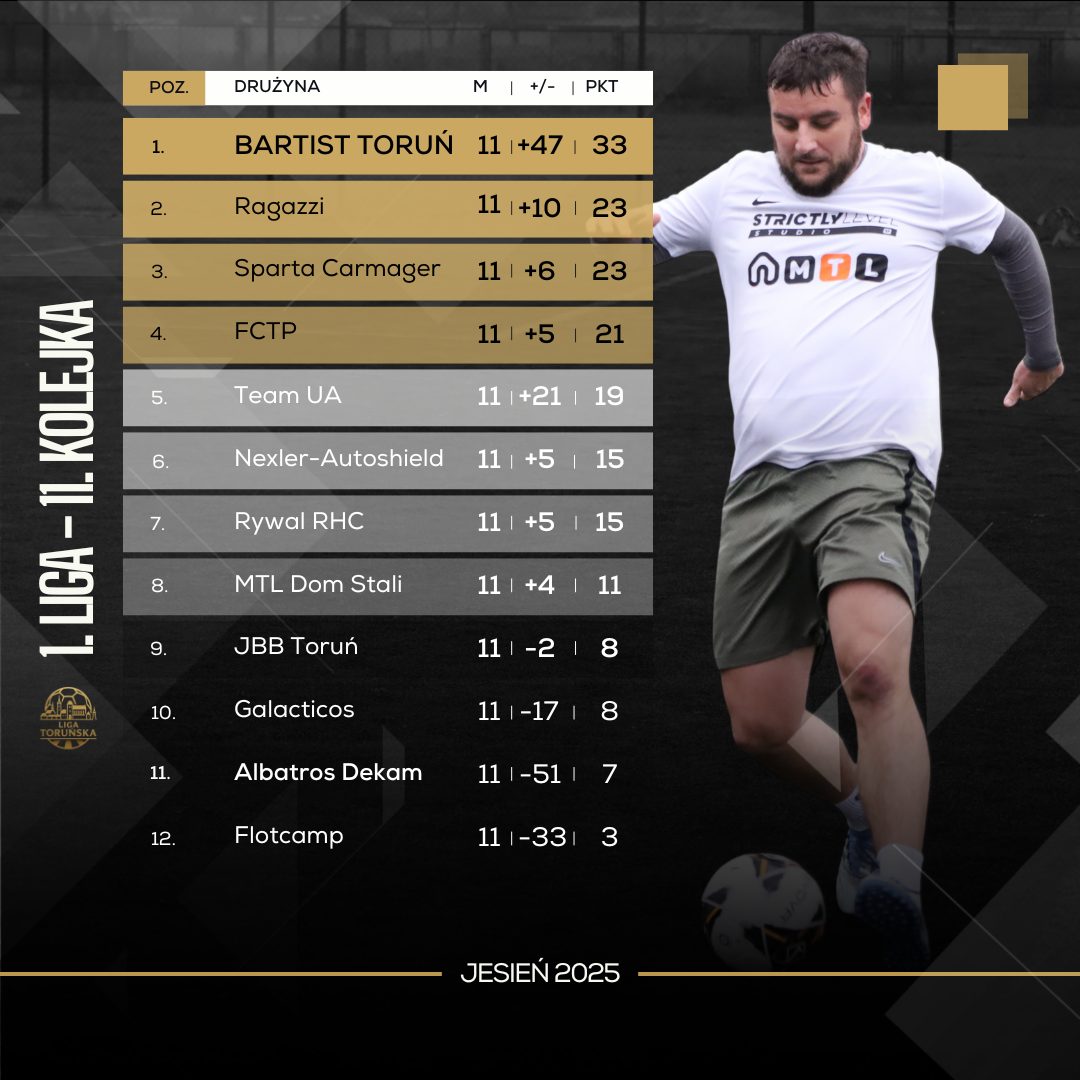 W ostatni weekend fazy zasadniczej sezonu 1. Ligi Toruńskiej działo się bardzo wiele. Przede wszystkim poznaliśmy mistrza, choć zawodnicy Bartistu z pewnością inaczej wyobrażali sobie przypieczętowanie trofeum – dwa spotkania, które miały zostać przez nich rozegrane w ten weekend zostały oddane przez rywali walkowerem. Wyniki niektórych pozostałych spotkań są bardzo zaskakujące, a część ekip zagrała jakby zapomniała, że wywalczone w ostatniej kolejce punkty są równie istotne, ponieważ w całości przechodzą do tabel kolejno: grupy mistrzowskiej, centralnej oraz spadkowej.