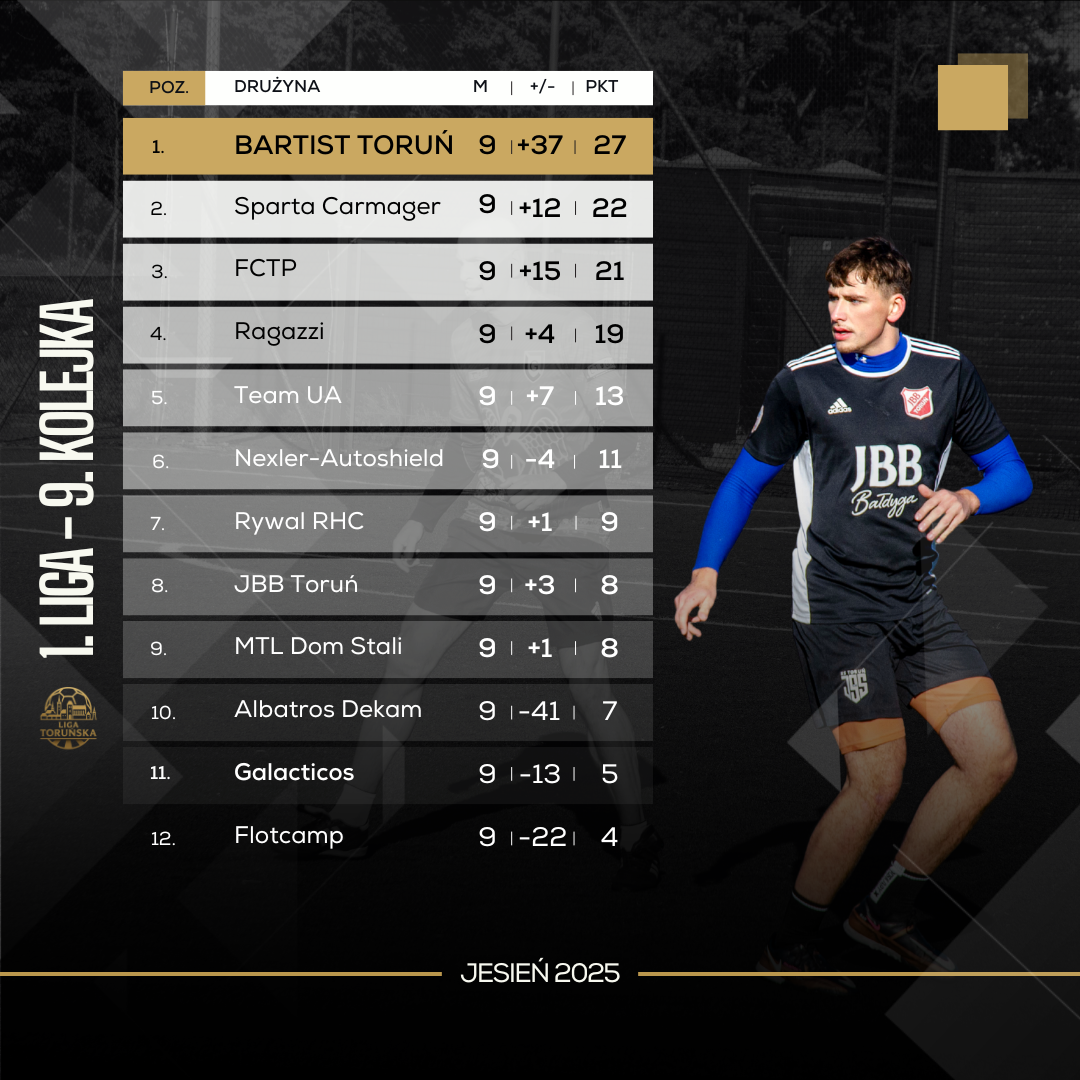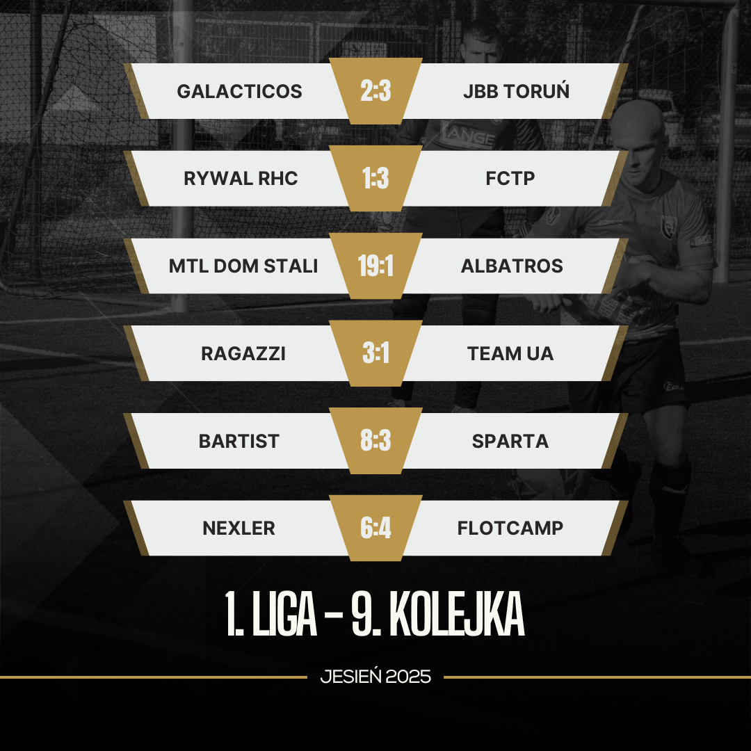 W 9. kolejce 1. Ligi Toruńskiej obyło się bez większych niespodzianek. Faworyci w większości wygrali swoje spotkania. W meczu na szczycie swoją wartość i mistrzowskie aspiracje udowodnił Bartist. Szokujący może być wynik spotkania Stali z Albatrosem, choć zagłębiając się w okoliczności tego meczu, końcowy rezultat staje się dużo mniejszym zaskoczeniem.