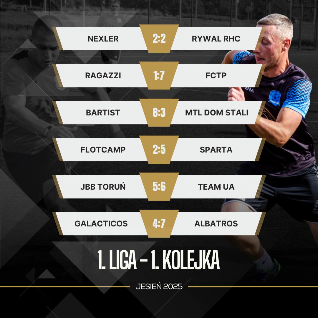 W 1. kolejce 1. Ligi Toruńskiej kilka wyników można była przewidzieć ale nie zabrakło też niespodzianek. Nexler z Rywalem zagrali na remis. FCTP uporało się z Ragazzi w imponującym stylu. Bartist zademonstrował swoją moc w starciu z Domem Stali. Flotcamp stawiał opór, ale to Sparta była górą. Mecz JBB z Team UA śmiało można nazwać najlepszym spotkaniem tej rundy rozgrywek. Galacticos natomiast uległo dosyć łatwo Albatrosowi.