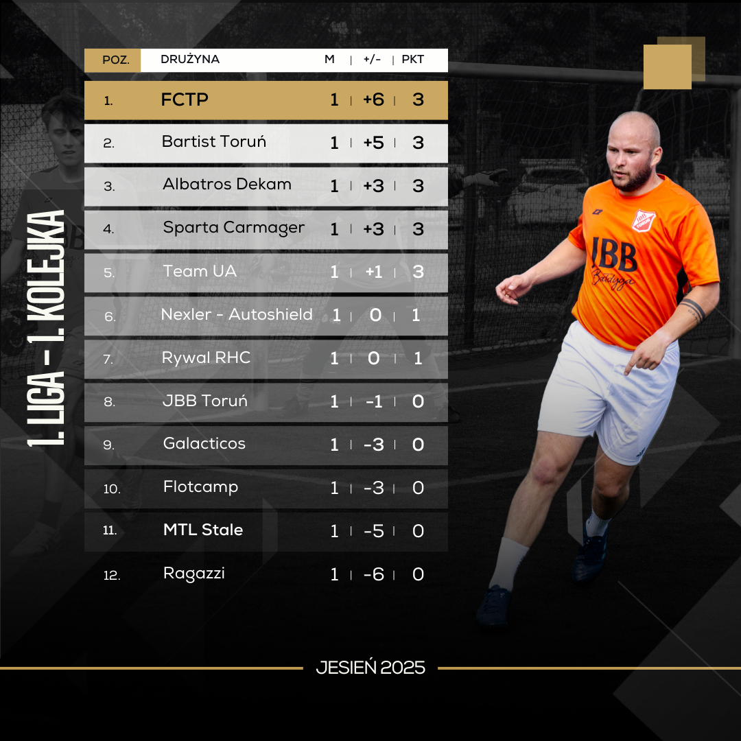 Starcie JBB Toruń z Team UA śmiało można nazwać najlepszym meczem 1. kolejki 1. Ligi Toruńskiej. Nie zabrakło w nim bramek i zwrotów akcji. W ostatniej minucie meczu JBB nie wykorzystało rzutu karnego, który mógł dać remis. Ostatecznie widzowie byli świadkami aż 11 trafień, z których autorem 3 był Yurii Markus z Team UA – MVP spotkania oraz zawodnik nominowany do szóstki kolejki. W obydwu ekipach odpowiedzialność za strzelanie bramek i asystowanie rozkładała się na wielu zawodników – to tylko potwierdza jak silnymi i wyrównanymi składami dysponują. Jeżeli utrzymają ten poziom to najbliżsi rywale obydwu drużyn będą mieć problem ze zdobyciem jakichkolwiek punktów.
