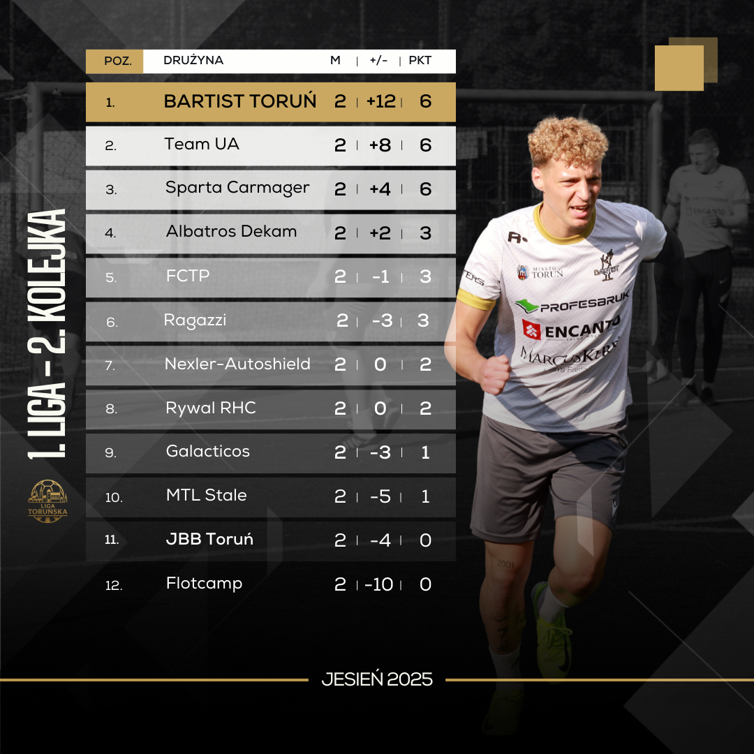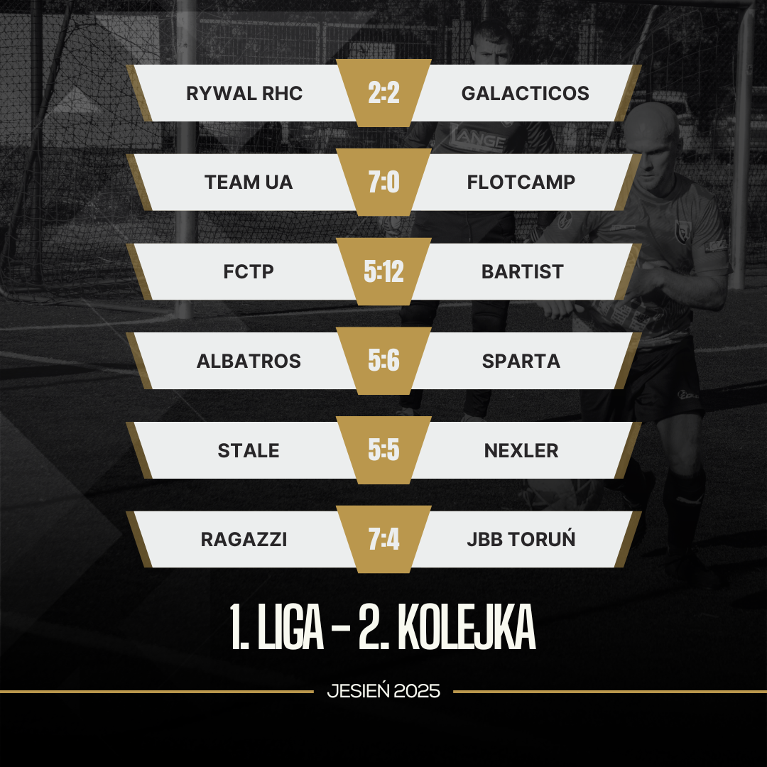 2. kolejka 1. Ligi Toruńskiej opiewała w bardzo ciekawe rezultaty. W niedzielę na boisku przy ulicy Rydygiera nie zabrakło niespodzianek i meczów pełnych zwrotów akcji. Bohaterowie poprzedniego weekendu – FCTP i Albatros Dekam, ulegli silnym rywalom, ale walczyli dzielnie – strzelili po 5 bramek. Rywal po raz kolejny zanotował remis – jednakże taki wynik z Galacticos należy uznać za cenną zdobycz. Team UA przejechał się po Flotcampie. Nexler podzielił się punktami z Domem Stali, a Ragazzi osiągnęło chyba najbardziej zaskakujący wynik tej kolejki – pewnie pokonało JBB.