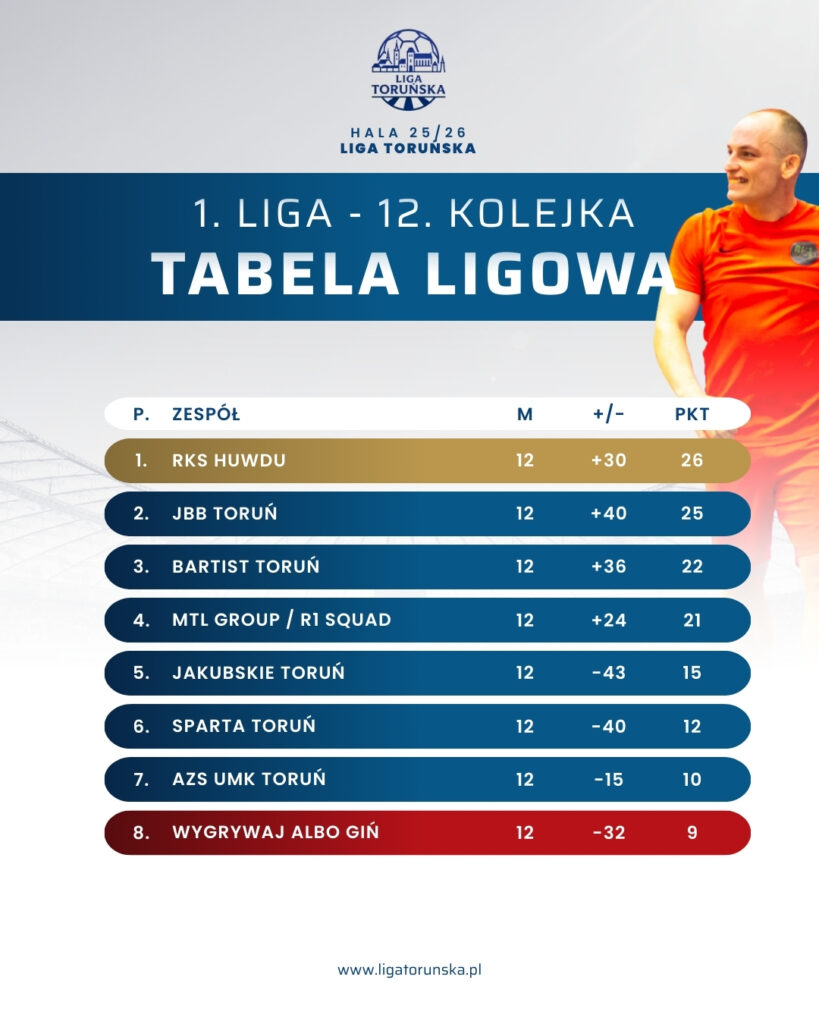 Festiwal strzelecki i powrót do gry o najwyższe cele zafundowali nam zawodnicy MTL Group / R1 SQUAD, którzy bezlitośnie wykorzystali kadrowe problemy Jakubskiego Toruń, wygrywając aż 13:3. Jakubskie, zmagające się z bardzo wąską ławką rezerwowych, miało siły jedynie na to, by przez pierwsze minuty dotrzymywać kroku i narzucać równe tempo. Gdy z czasem tlenu zaczęło brakować, R1 wrzuciło wyższy bieg, całkowicie odskakując rywalom. Ten triumf pozwala R1 SQUAD (21 punktów) wciąż realnie myśleć o ligowym podium. Zadanie nie będzie jednak łatwe, bo choć w 13. kolejce zagrają z szóstą Spartą, to w wielkim finale sezonu czeka ich niezwykle trudne starcie z liderem, RKS Huwdu.