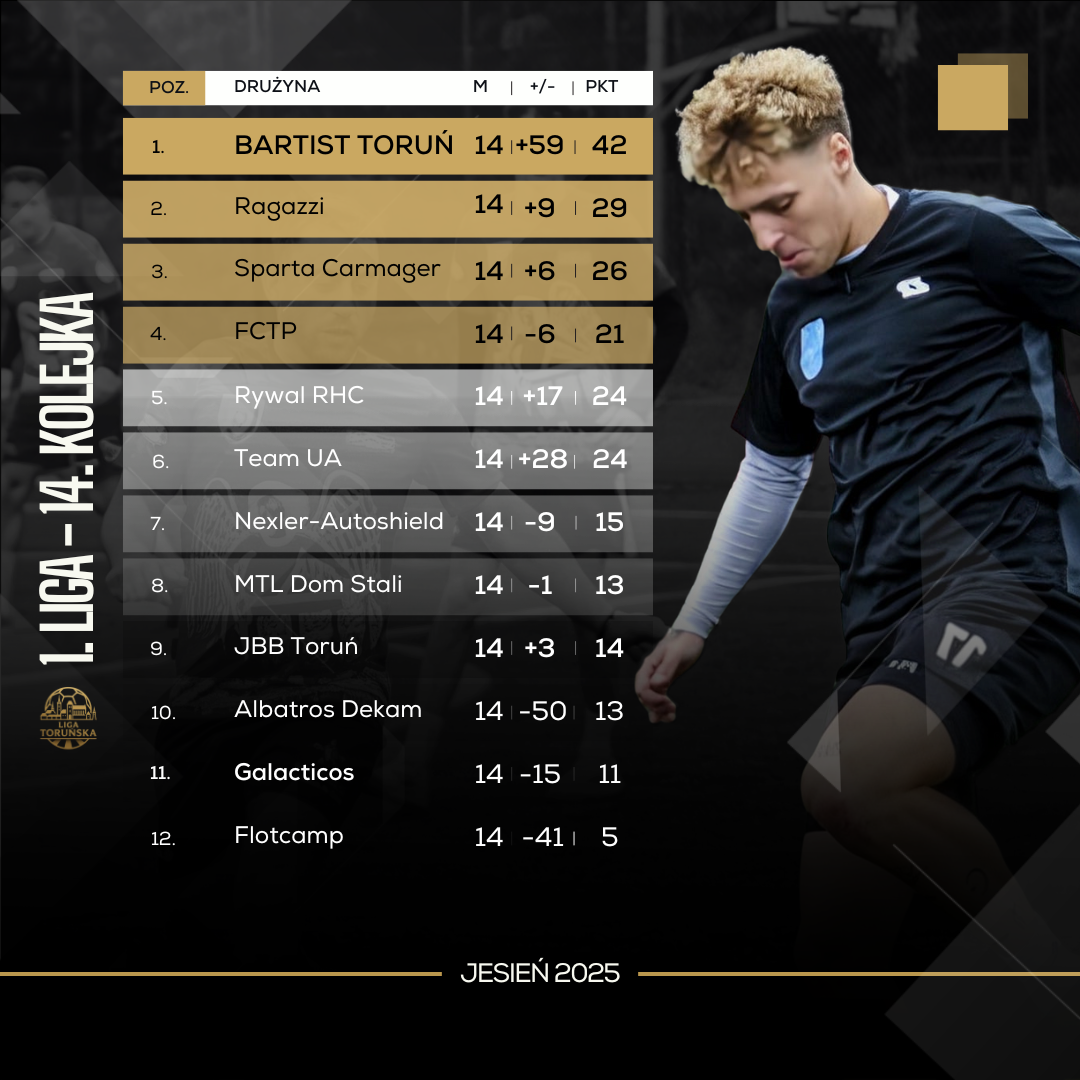 Mecze grupy mistrzowskiej w ostatniej kolejce sezonu przyniosły spodziewane emocje i wiele bramek. W bezpośrednim starciu o trzecie miejsce Sparta Carmager Toruń pokonała pewnie FCTP. Do zwycięstwa tym razem swoją ekipę poprowadził Adam Czajkowski, który zanotował 1 bramkę i 3 asysty. Zawodnik ten znalazł się również w szóstce kolejki tego weekendu. Dwie bramki do swojego dorobku dołożył także Jarosław Zawada walczący o koronę króla strzelców, jednak jak się później okazało, to było o wiele za mało. W bezpośrednim pojedynku mistrza z wicemistrzem Bartist Toruń okazał się lepszy od Ragazzi. Zgodnie z przewidywaniami, mecz pozbawiony większej stawki przyjął kształt świetnego widowiska z dużą ilością bramek – ostatecznie kibice obejrzeli aż 22 trafienia. Taki przebieg meczu najbardziej odpowiadał Łukaszowi Sikorskiemu, który strzelił 8 (!) bramek i zapewnił sobie zwycięstwo w klasyfikacji najlepszych strzelców sezonu. Zwycięzca wszystkich najważniejszych klasyfikacji indywidualnych został wybrany również najlepszym zawodnikiem całego weekendu w 1. Lidze. Oprócz niego do szóstki kolejki trafił również jego kolega z drużyny – Maciej Andrzejewski, który do 6 asyst dołożył 1 bramkę. Bartist zakończył rozgrywki z kompletem zwycięstw i ponad 100 strzelonymi bramkami udowadniając, że w toruńskiej piłce sześcioosobowej jest to zdecydowanie najlepsza drużyna.