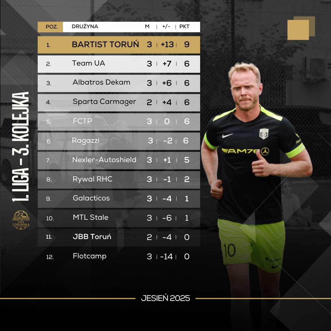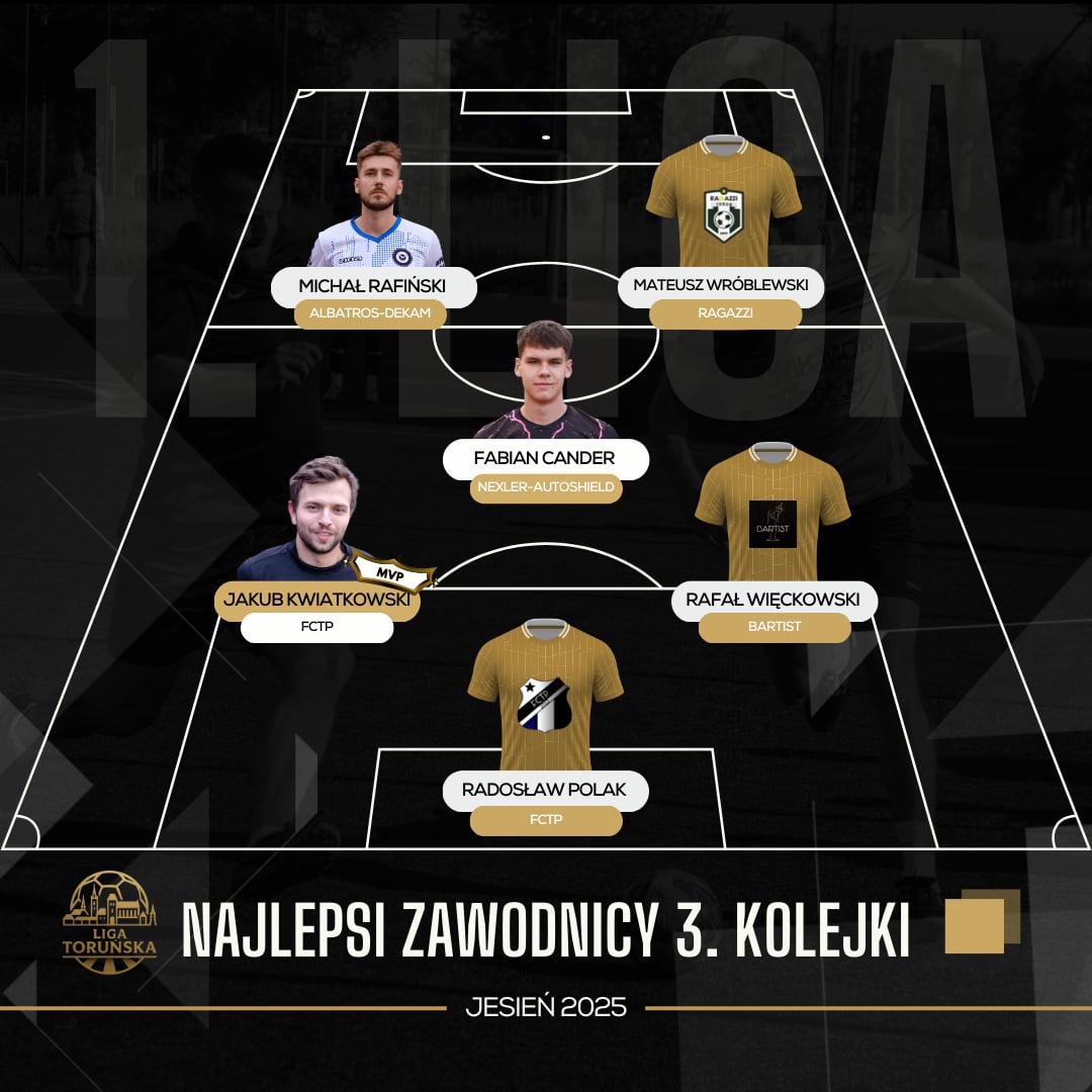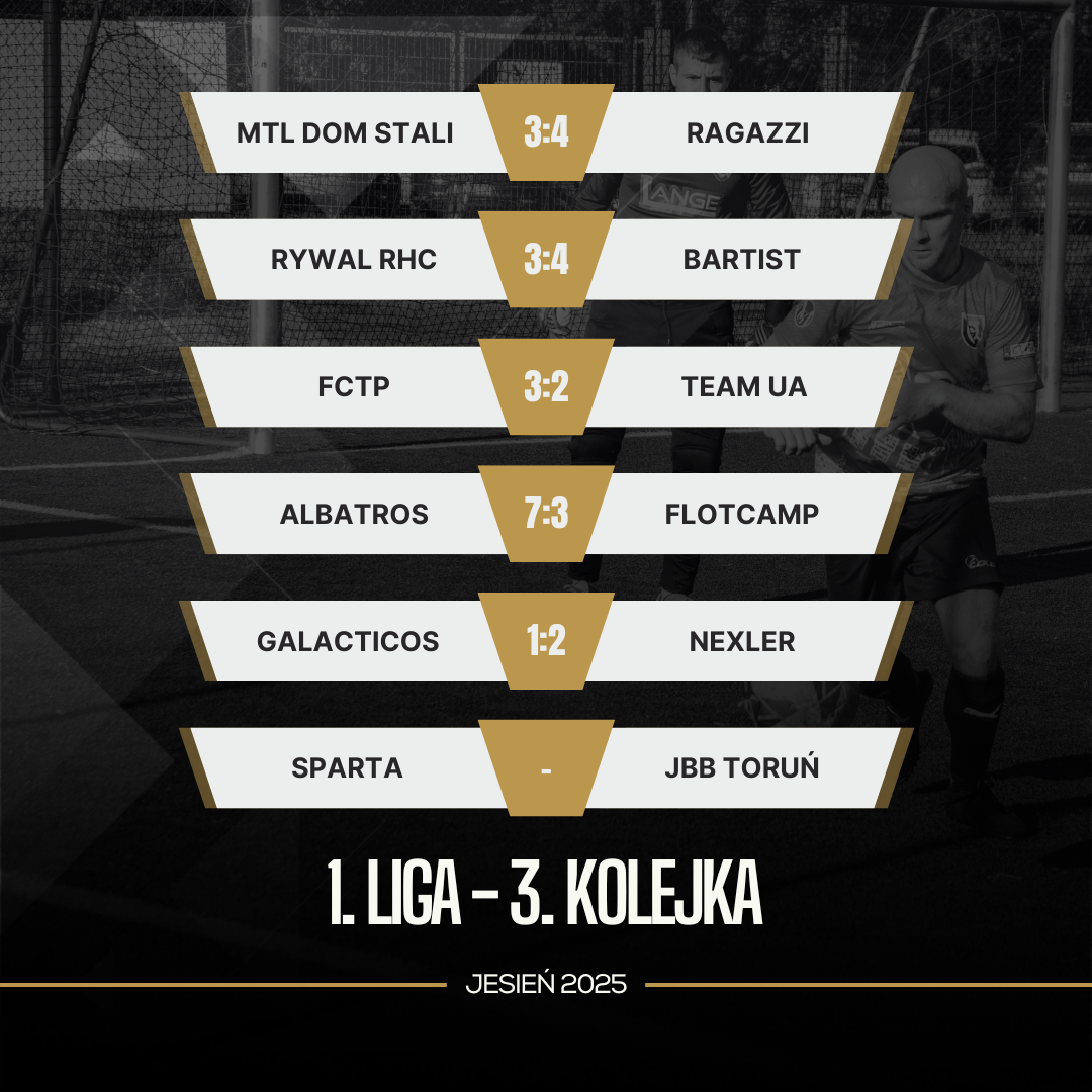 Zmagania pierwszoligowców w trzeciej kolejce zakończył mecz Galacticos Lizard King Toruń z Nexler-Autoshield. Spotkanie było bardzo wyrównane i obfitowało w wiele emocji zarówno, jeśli chodzi o wydarzenia boiskowe, jak i decyzje sędziego. Ostatecznie o jedną bramkę lepsza była młoda ekipa Nexler, a bohaterem meczu został zdobywca dwóch goli Fabian Cander. Zawodnik ten trafił do szóstki kolejki. Po serii dwóch remisów Nexler w końcu zanotował komplet punktów i na ten moment należy do szczupłego grona drużyn niepokonanych w tym sezonie. Spotkanie Sparta Carmager Toruń vs JBB Toruń zostało przełożone na inny termin.