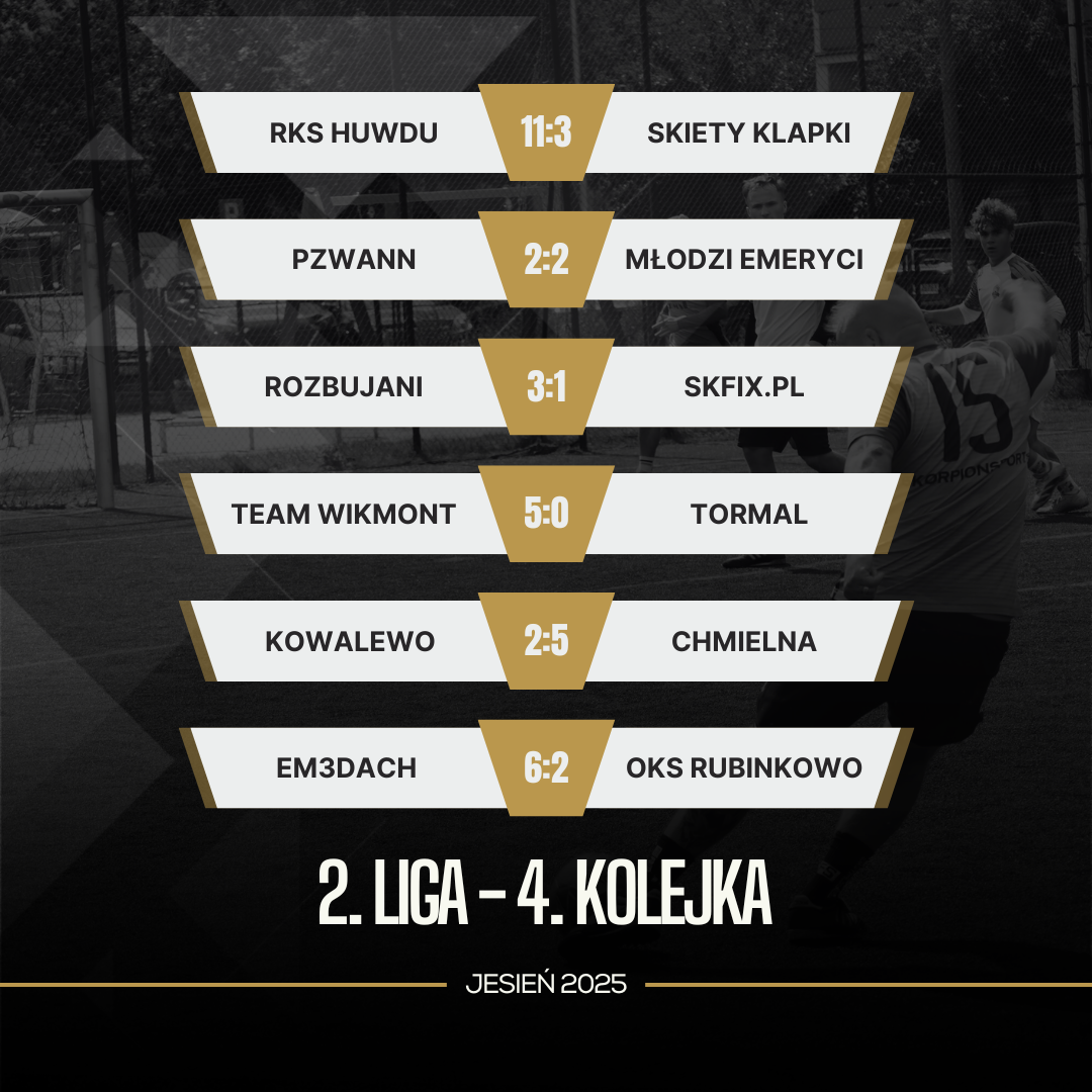 Jeśli wymieniać drużyny, które grają poniżej oczekiwań, to na pierwszy plan wysuwają się QJAWY Skiety Klapki. Przyjście bez żadnego rezerwowego na mecz z liderem nie mógł skończyć się w inny sposób. RKS Huwdu doszczętnie wykorzystało bolączkę ekipy Dominika Dunajskiego strzelając 11(!) bramek, tracąc zaledwie 3. Zawodnikiem spotkania został Alan Gierlikowski, który w drugiej połowie więcej czasu spędził na połowie przeciwnika, aniżeli w swoim polu karnym. Niemal każdy zawodnik lidera tabeli wpisał się w protokół meczowy z golem lub asystą, a sam zespół przoduje w tabeli generalnej z przewagą 5 punktów, a przypominamy, że to dopiero 4 kolejka! Wyrasta nam zespół, którego zatrzymanie zaczyna graniczyć z piłkarskim cudem. Skiety ciągle mają czas, żeby namieszać, ale bez rezerwowych, walka o medale będzie coraz trudniejsza..
