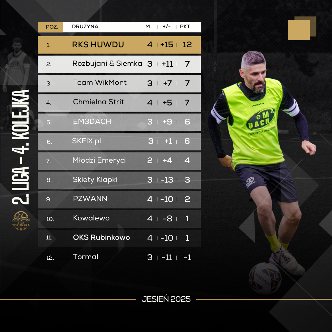 Niedzielne pojedynki drugiego poziomu rozgrywkowego Ligi Toruńskiej minęły pod pryzmatem deszczowej pogody. Jesienna aura nie zmieniła nastroju RKSu Huwdu, który idzie jak burza i notuje kolejne zwycięstwo z rzędu. Dziwi postawa zawodników z ostatniego miejscu, bowiem Tormal oddał swój mecz walkowerem, i dalej notuje zerową zdobycz punktową..