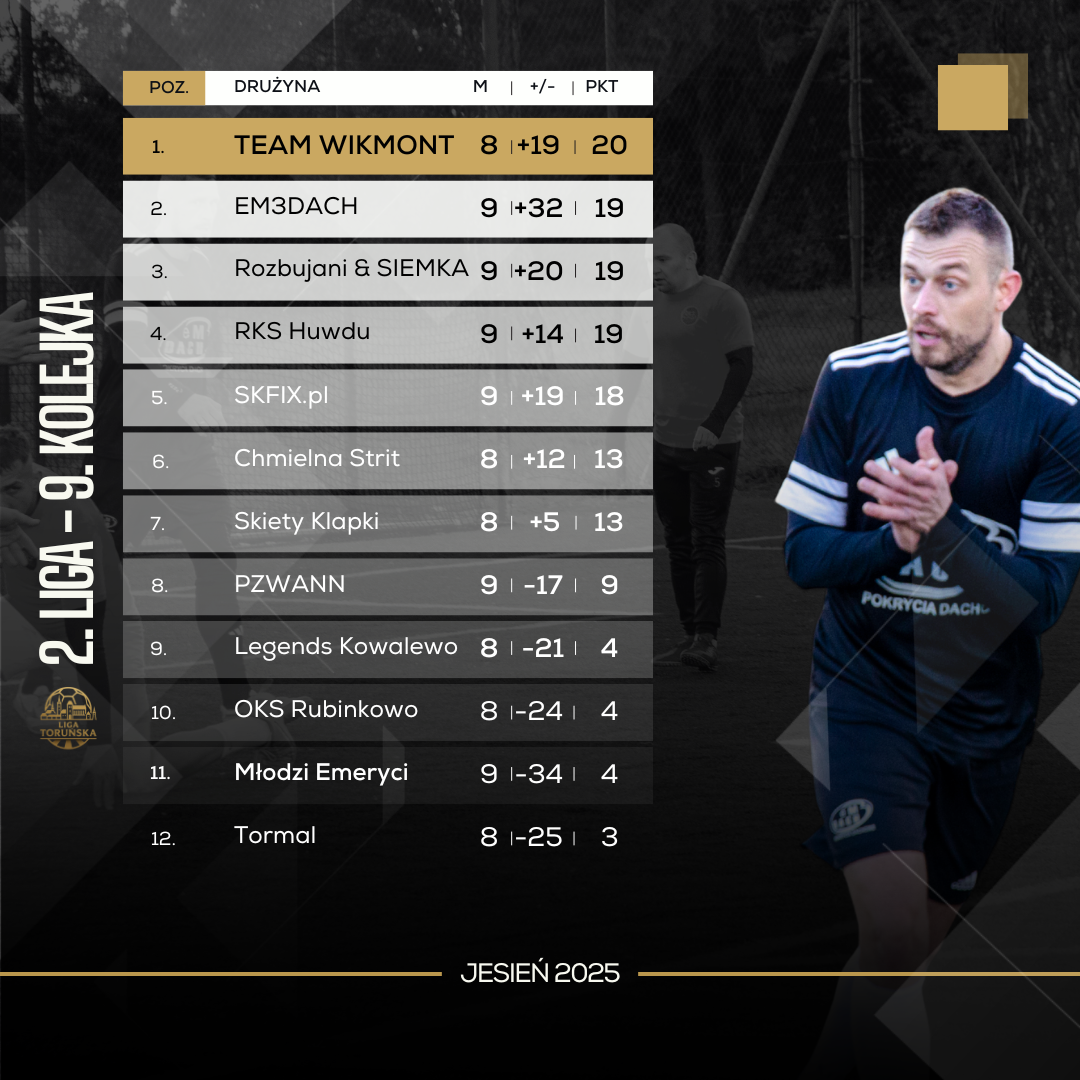 Nowy lider 2. Ligi Toruńskiej, Team WikMont, wygrał swoje spotkanie z FC Legends Kowalewo Pomorskie, dzięki czemu to oni noszą teraz, jak niegdyś Adam Małysz, żółtą koszulkę. 3 punkty nie przyszły jednak łatwo, bowiem wygrana 2:1 z Kowalewem okazała się nie lada wyzwaniem. Łukasz Pacholec ewidentnie zmotywował swój zespół i długo walczył z zespołem Karola Pawlika jak równy z równym. Z najważniejszych informacji, lider dalej niepokonany, a zawodnikiem spotkania został Bartosz Łagodziński. Kowalewo ma w swoim terminarzu spotkania z Tormalem, Huwdu oraz EM3DACH. Szansa na wydostanie się z grupy spadkowej wygląda nad wyraz mizernie. Team WikMont w o wiele lepszej sytuacji może patrzeć w przyszłość. Skiety, Młodzi Emeryci i PZWANN spróbują pokonać niepokonanych.