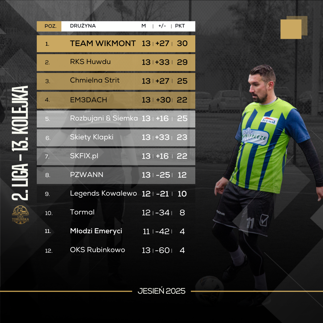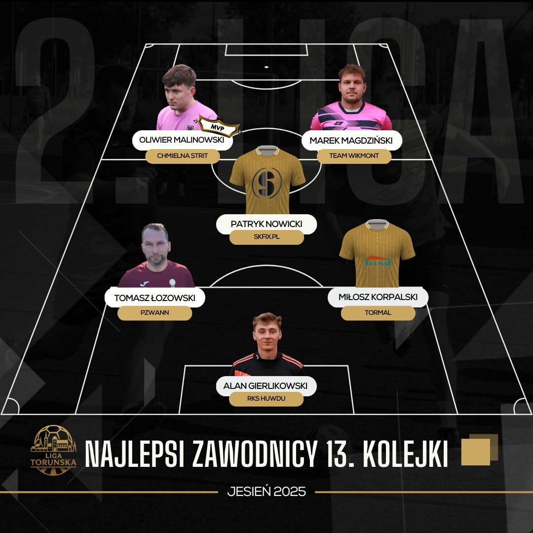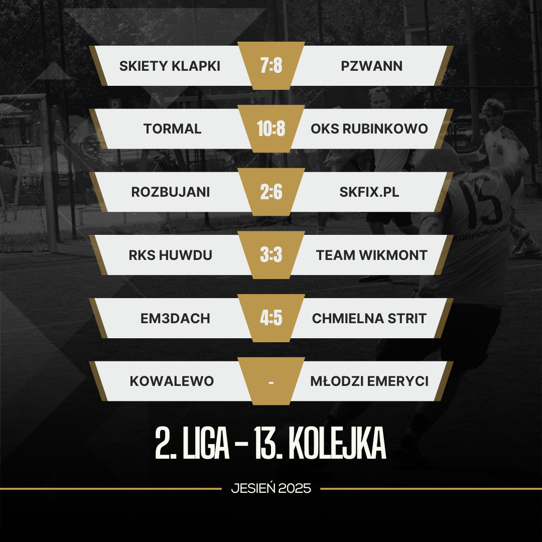 W spotkaniu na szczycie emocji nie zabrakło do samego końca. Pojedynek Team WikMont vs RKS Huwdu opiewał w masę akcji oraz emocji. Rollercoaster jeździł aż do ostatniego gwizdka, gdzie na chwilę przed nim, bramkę na 3:3 strzelił Wiktor Siołkowski (Team WikMont). Remis ten pozostawił aktualnych liderów na szczycie i złote medale są teraz na wyciągnięcie ręki. Wspaniała kampania obu zespołów kończy się po raz drugi podziałem punktów, co pokazuje zaciętą rywalizację o pierwsze miejsce. Z gwiazdką zakończył te spotkanie Marek Magdziński (gol i asysta), ale do szóstki kolejki załapał się również Alan Gierlikowski. W meczu pomiędzy EM3DACH oraz Chmielna Strit również nie brakło chwil z podwyższonym ciśnieniem. Minimalnie lepsza, po 50 minutach spotkania, okazała się Chmielna, która zwyciężyła 5:4. Wielki krok w boju o brązowe medale, ale na szczególne wyróżnienie zasługuje Oliwier Malinowski, motor napędowy zwycięzców, który skompletował hat-tricka, dopisał asystę oraz walczy o miano zawodnika 13. kolejki. Dachy mają dalej tyle samo punktów, co Chmielna, więc to ostatnia kolejka będzie przysłowiową “kropką nad i” dla całego top 4.