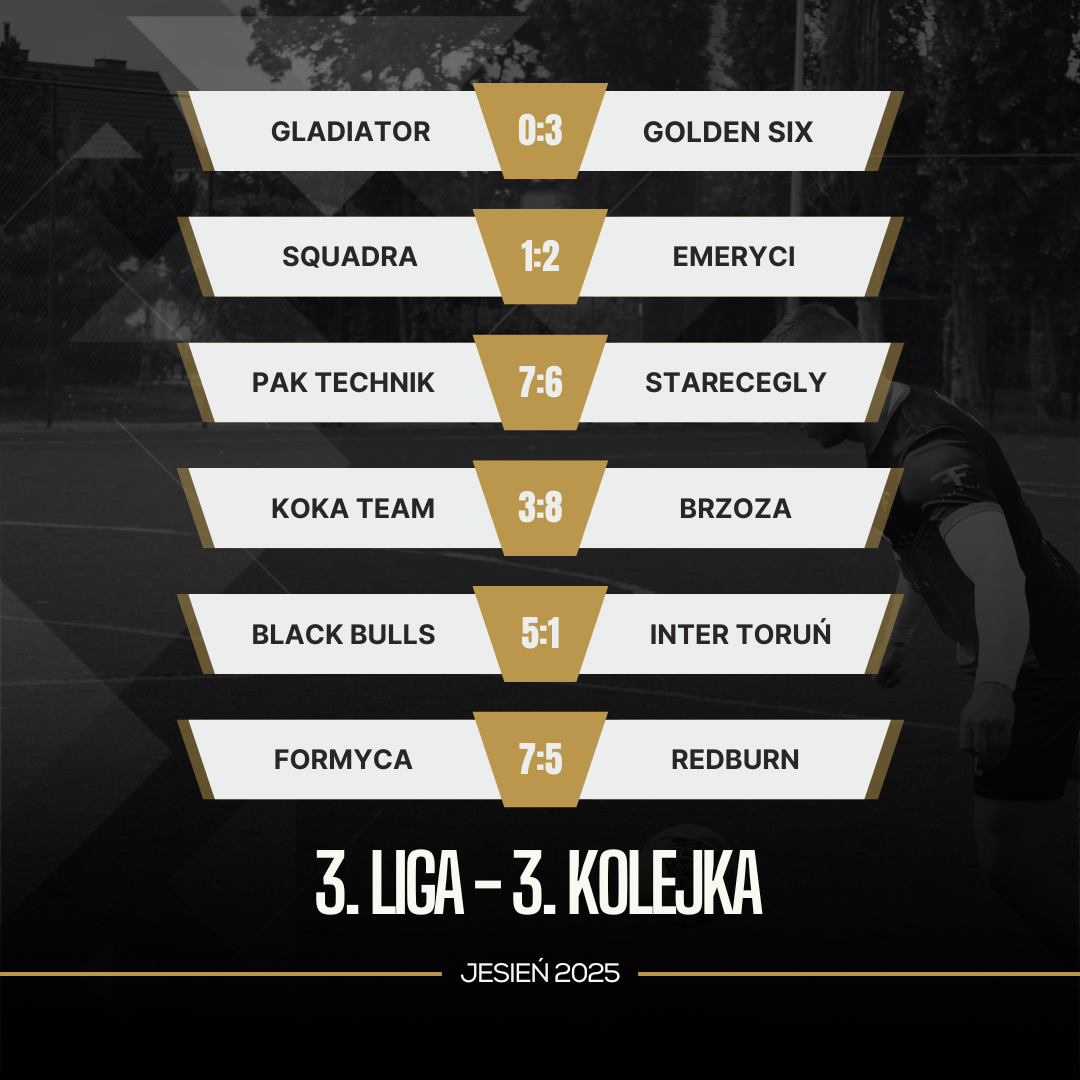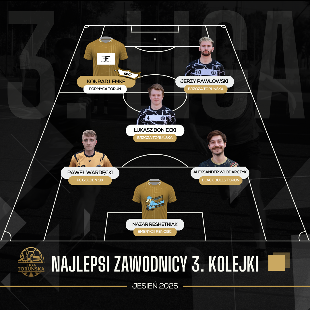 Na zakończenie kolejki doszło do sporej niespodzianki – Formyca Toruń, która do tej pory nie zdobyła żadnego punktu, ograła Redburn Kamlex 7:5. Bohaterem spotkania był Konrad Lemke, autor pięciu bramek i jednocześnie MVP nie tylko tego meczu, ale całej 3. kolejki. Drużyna Patryka Bensa pokazała widowiskowy futbol i przede wszystkim zaprezentowała się w mocnym zestawieniu kadrowym, co przyniosło wymierny efekt. To zwycięstwo może być przełomowym momentem dla Formycy, która do tej pory miała problem ze stabilizacją składu. Jeśli utrzymają taką frekwencję i zaangażowanie, mogą jeszcze sporo namieszać w lidze.