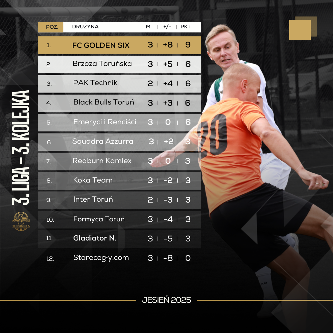 Mecz Koki Team z Brzozą Toruńską zapowiadał się jako wyrównane widowisko, ale na boisku obraz gry był zupełnie inny. Brzoza zagrała koncertowo, wygrywając aż 8:3, a jej liderzy – Łukasz Boniecki i Jerzy Pawłowski – byli nie do zatrzymania i obaj trafili do najlepszej szóstki kolejki. „Derby weteranów” pomiędzy Jarosławem Tebecio a Czesławem Wysockim tym razem padły łupem drużyny tego drugiego, która dzięki wygranej awansowała na pozycję wicelidera tabeli. Tak wysoka wygrana to mocny sygnał dla rywali – Brzoza nie tylko punktuje, ale robi to w efektownym stylu. Koka Team natomiast musi wyciągnąć wnioski z tej porażki, zwłaszcza w kontekście gry defensywnej, która nie wytrzymała naporu przeciwnika.