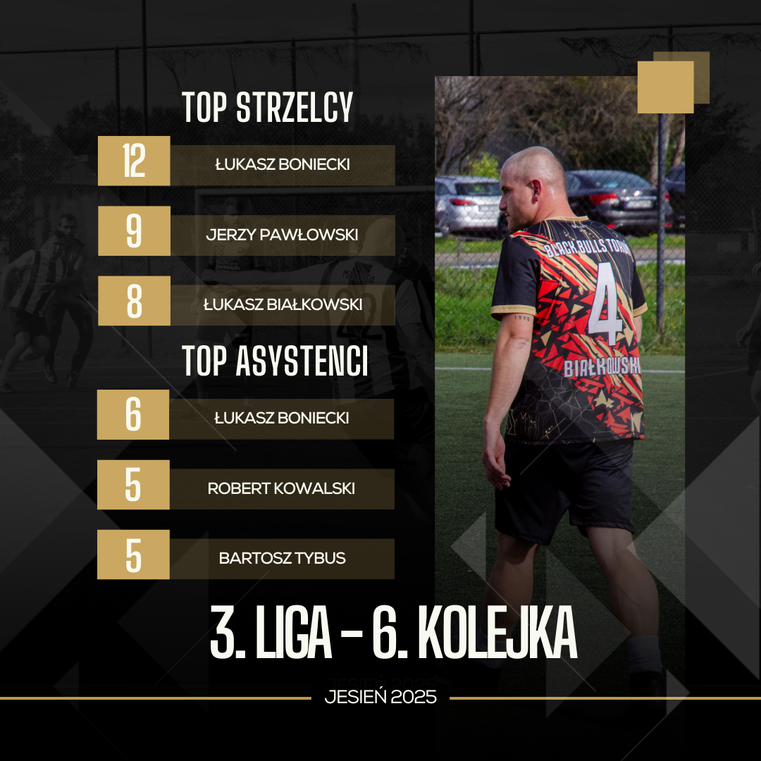 Po sześciu kolejkach 3. Ligi doczekaliśmy się zmiany lidera. Dotychczas prowadzący FC Golden Six zanotował drugą porażkę z rzędu, a okazję wykorzystał Pak Technik, który efektownie rozbił Redburn Kamlex aż 7:0. Co ciekawe, do przerwy na tablicy widniał bezbramkowy remis, a w bramce Redburn świetnie spisywał się Kevin Schafer. Druga połowa okazała się jednak koncertem gry zawodników Mateusza Rembezy, którzy pokazali skuteczność i ofensywną moc. Największym bohaterem był Robert Kowalski – trzy gole i dwie asysty mówią same za siebie. Pak Technik wysyła wyraźny sygnał, że nie zamierza oddać pierwszego miejsca w tabeli łatwo.