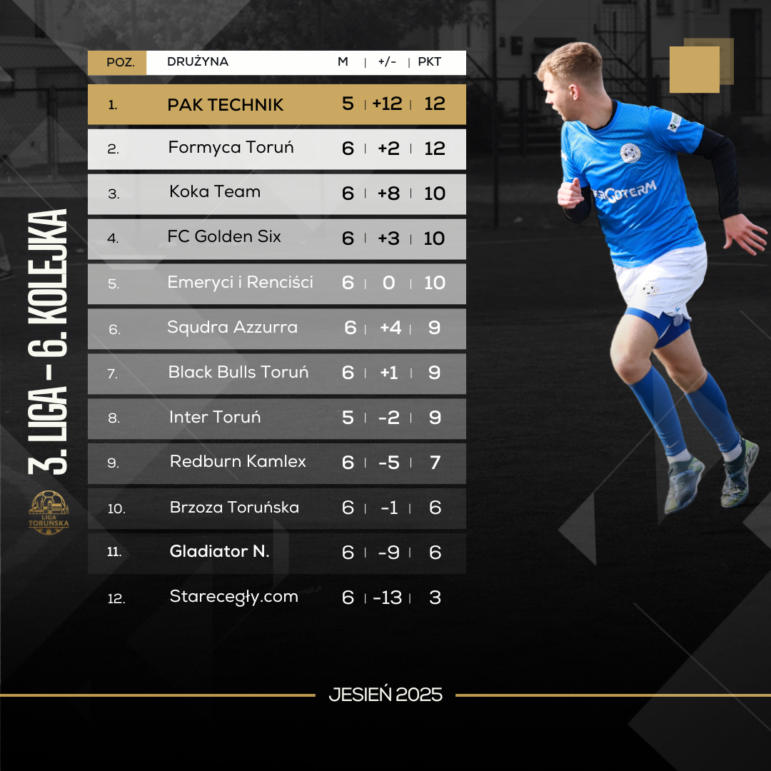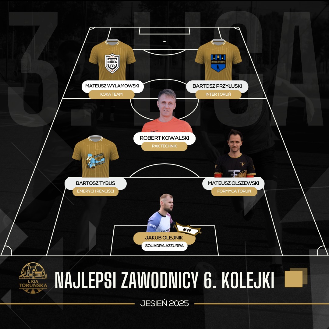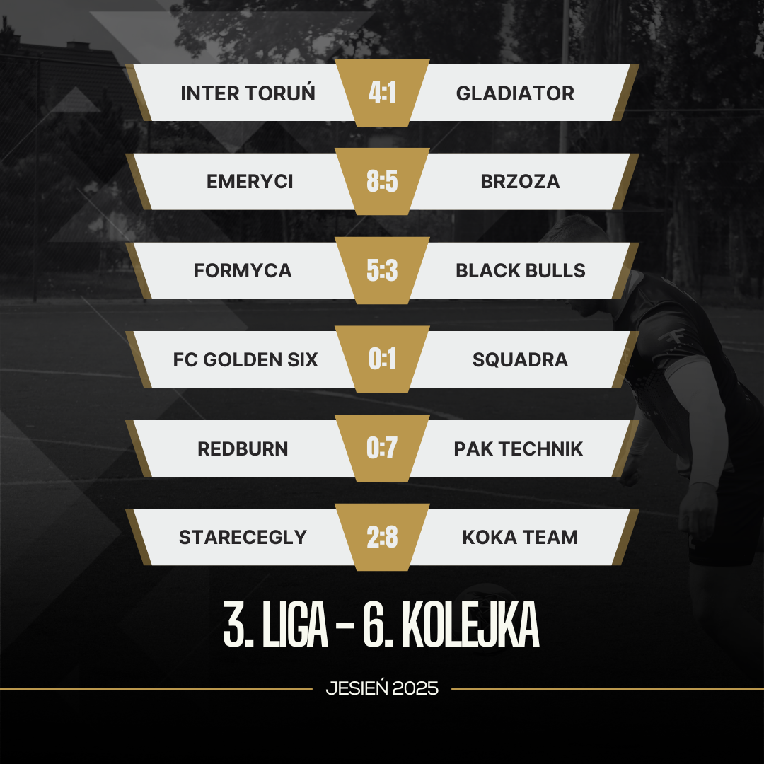 Na zwycięski szlak powrócił Inter Toruń, który pewnie pokonał Gladiatora Nieszawka 4:1. Liderem zespołu był Bartosz Przyłuski, zdobywca dwóch bramek i najlepszy zawodnik spotkania. Inter dzięki trzem punktom wydostał się ze strefy spadkowej i może patrzeć w przyszłość z większym optymizmem. Z kolei dla Gladiatora był to kolejny bolesny tydzień – druga porażka z rzędu i spadek w tabeli powodują, że atmosfera w drużynie Piotra Błażejewicza robi się coraz trudniejsza. Aby wrócić na właściwe tory, Gladiator musi szybko poprawić skuteczność i ustabilizować formę, bo inaczej walka o utrzymanie może okazać się realnym scenariuszem.