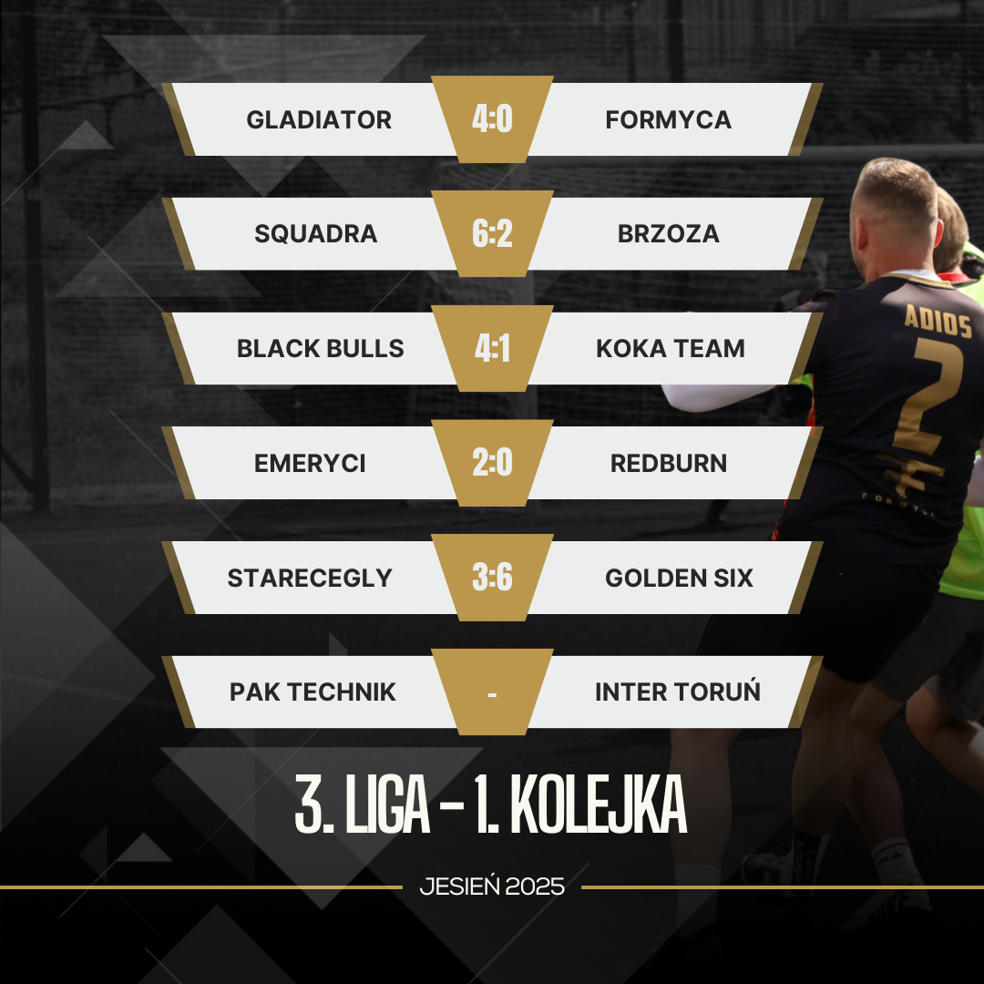Najwięcej bramek padło w spotkaniu pomiędzy Starecegly.com a FC Golden Six. Początek należał do ekipy Arkadiusza Jastrzębskiego, która szybko wyszła na prowadzenie, jednak w miarę upływu minut to „Goldeni” przejęli inicjatywę. Wysoka skuteczność i konsekwentna gra ofensywna pozwoliły im odrobić straty, a następnie odskoczyć rywalowi i zwyciężyć 6:3. Kluczową postacią był Paweł Kazaniecki, który nie tylko zdobywał bramki, ale też napędzał kolejne ataki i w pełni zasłużenie trafił do najlepszej szóstki kolejki. Dzięki takiej inauguracji FC Golden Six od razu stawia się w gronie drużyn, które mogą powalczyć o czołowe lokaty, a ich ofensywa robi wrażenie już na starcie sezonu.