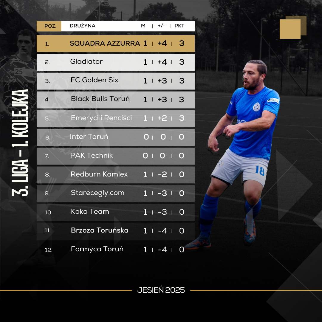 Na orliku przy ul. Rydygiera Squadra Azzurra rozpoczęła sezon w znakomitym stylu, pewnie pokonując Brzozę Toruńską 6:2. Rywale wyraźnie odczuli brak swojego lidera, Mateusza Bonieckiego, i nie byli w stanie zatrzymać dobrze dysponowanej Squadry. Głównym bohaterem meczu został Damian Motylewski – autor hat-tricka, uznany MVP spotkania i, co więcej, przez redakcję wyróżniony jako najlepszy zawodnik całej kolejki. Już w pierwszym występie Squadra wysłała jasny sygnał, że w Lidze Toruńskiej stać ją na walkę o coś więcej niż tylko środek tabeli. Ostatecznie jednak to nadchodzące spotkania pokażą, czy drużyna jest gotowa na rywalizację z najlepszymi.