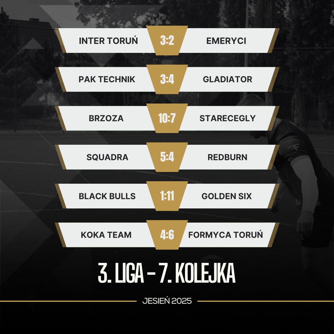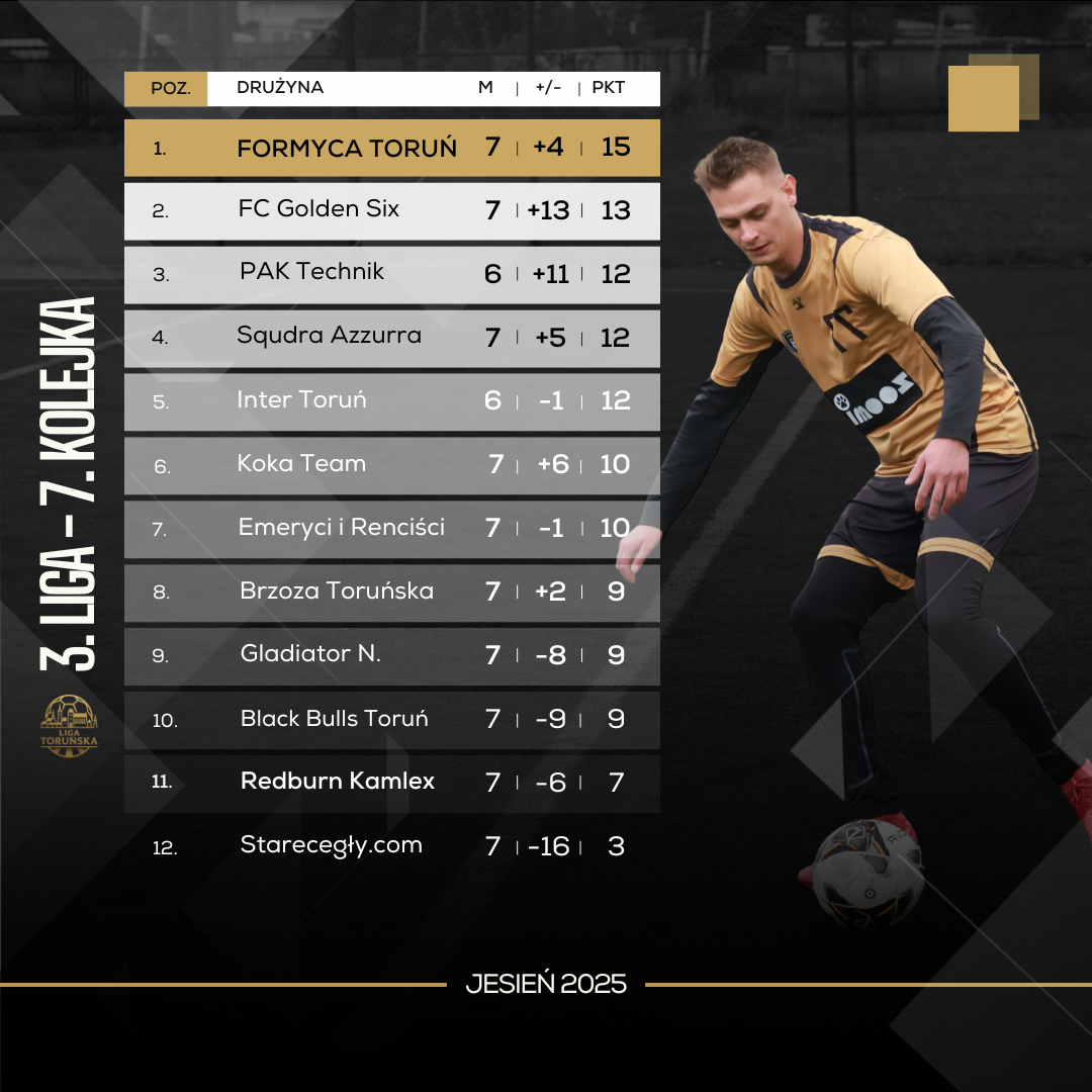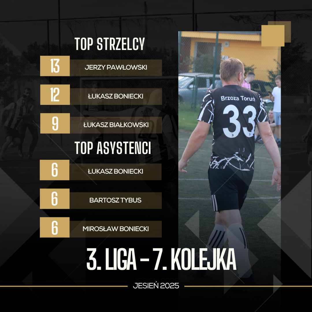 Każdy, kto oczekiwał dużej dawki emocji w siódmej kolejce 3. Ligi, z pewnością nie czuje się zawiedziony. Byliśmy świadkami prawdziwego piłkarskiego rollercoastera – od zaciętych spotkań po niespodzianki i grad goli. Kolejka przyniosła zmianę lidera, a tabela zrobiła się jeszcze bardziej ciasna niż wcześniej. To był weekend, który po raz kolejny udowodnił, że 3. Liga Ligi Toruńskiej nie ma słabych drużyn, a każdy mecz to osobna historia.