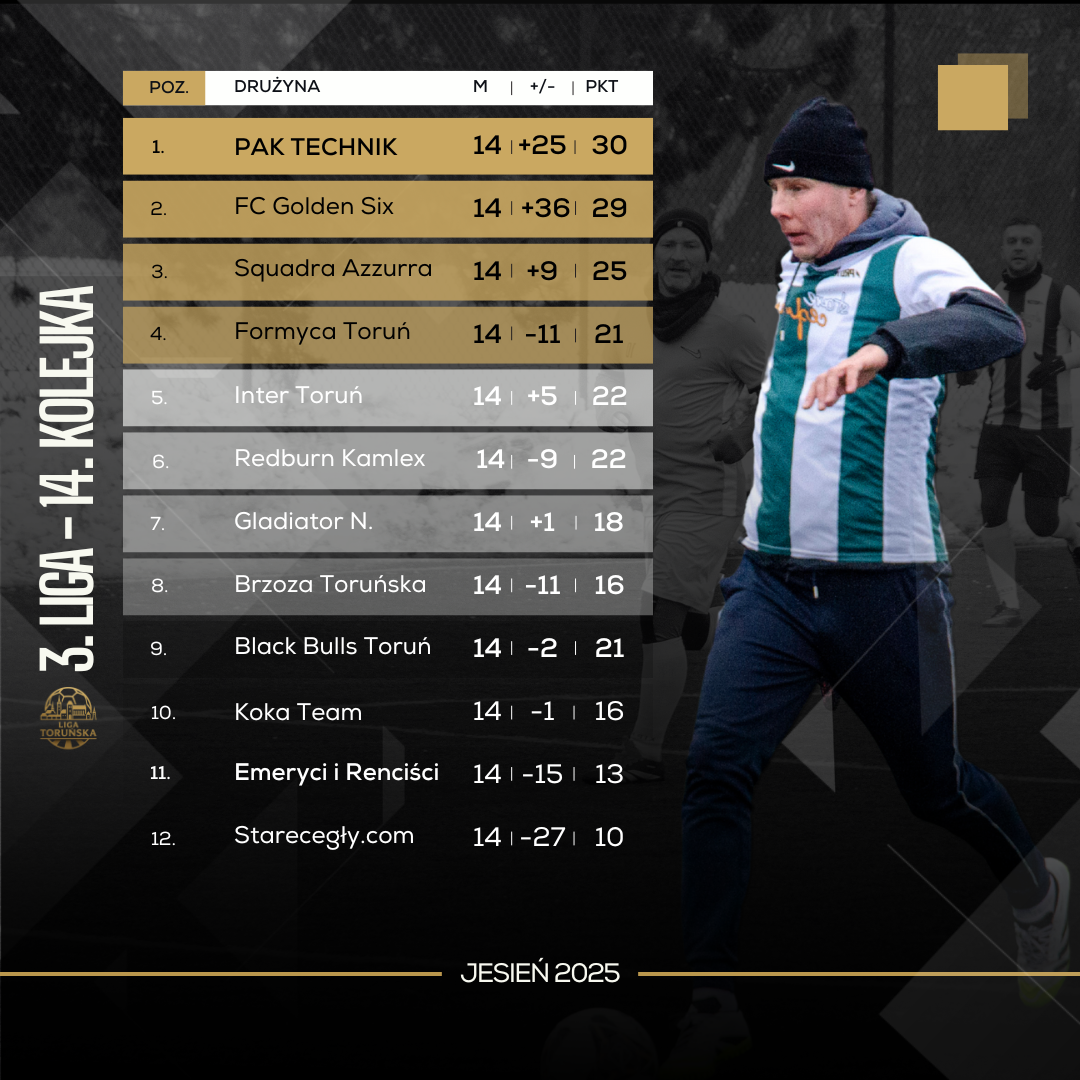 Squadra próbowała wszystkich dostępnych środków, by przechylić szalę zwycięstwa na swoją stronę. Atak za atakiem, kolejne próby konstruowania akcji, narastająca presja czasu… Jedno było pewne – determinacji im nie brakowało. Na trzy minuty przed końcem drużyna Stanisława Makucha wciąż przegrywała, jednak w 47. minucie Szymon Żbikowski dał zespołowi nadzieję na przedłużenie szans w walce o srebro. Ostatecznie mecz zakończył się remisem 2:2, który przesądził o końcowym układzie podium: Squadra Azzurra – brąz, FC Golden Six – wicemistrzostwo, Pak Technik – mistrz 3. Ligi.