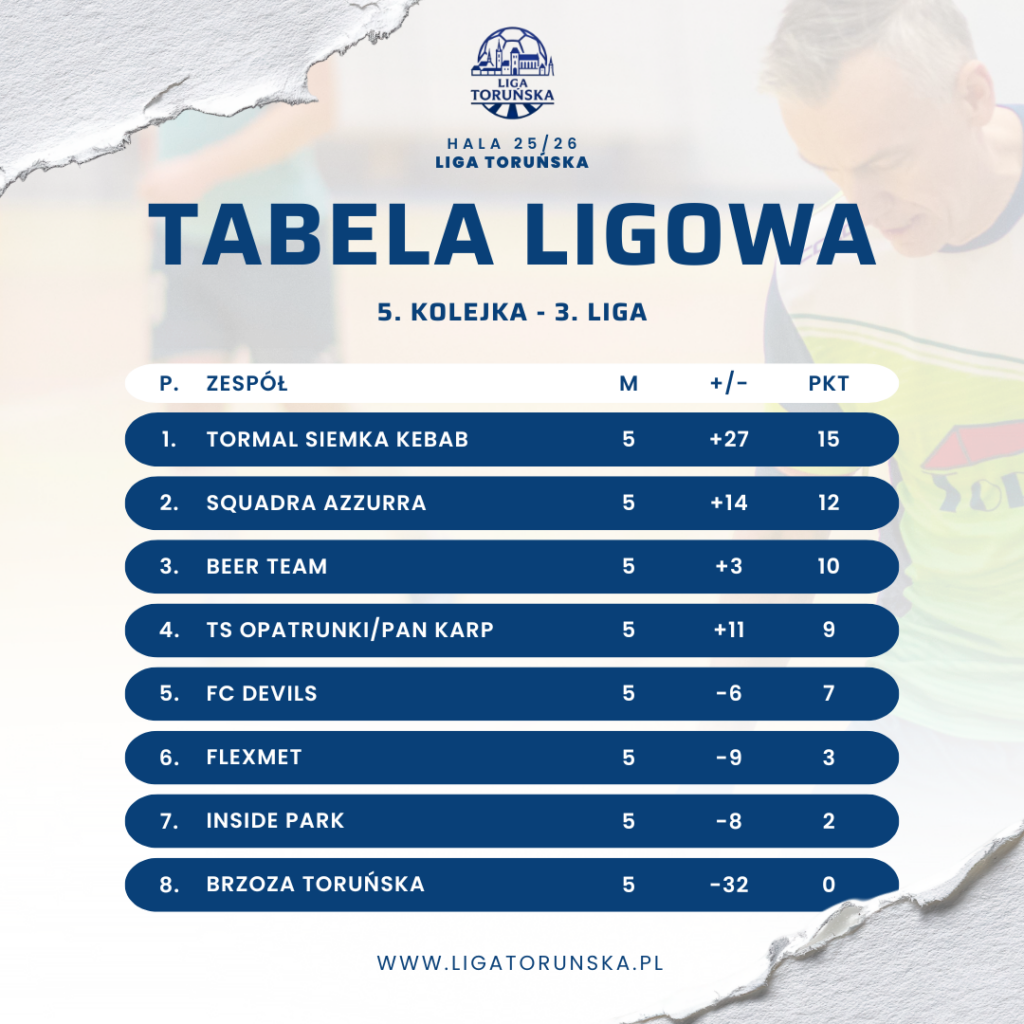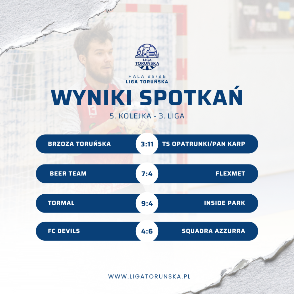 W sobotnim spotkaniu TS Opatrunki/Pan Karp nie dały szans Brzozie Toruńskiej, wygrywając aż 11:3. Kluczową rolę odegrał duet Szymon Guranowski – Mateusz Urbański, który łącznie zdobył osiem bramek i kompletnie zdominował defensywę rywali. Opatrunki od pierwszych minut kontrolowały przebieg meczu, natomiast Brzoza z każdą kolejną straconą bramką traciła wiarę w nawiązanie walki. Po pięciu kolejkach Brzoza pozostaje jedyną drużyną w 3. Lidze bez punktu, a sytuacja w tabeli staje się dla niej coraz bardziej wymagająca.