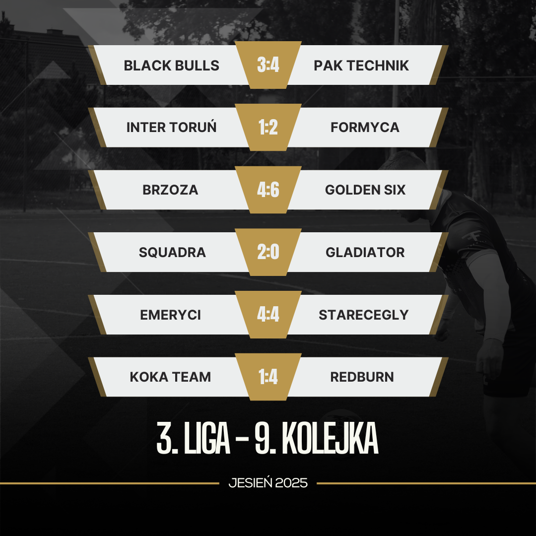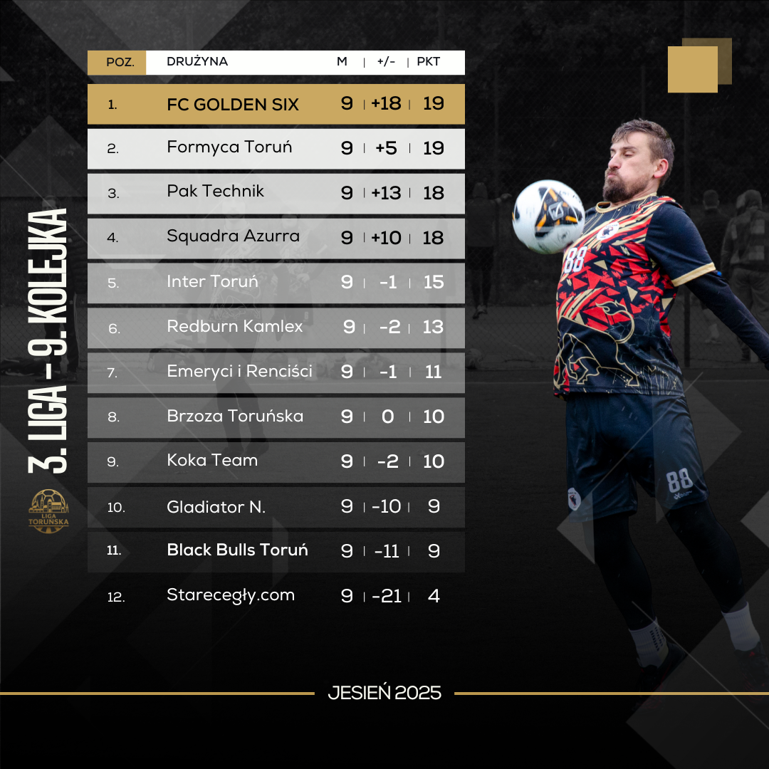Formyca po zwycięstwie nad Interem utrzymał kontakt z czołówką, zrównując się punktami z Golden Six, którzy ograli Brzoze – obie drużyny mają po 19 punktów i przewodzą tabeli 3. Ligi. Choć teoretycznie mogą czuć się bezpiecznie, praktyka pokazuje, że nawet minimalny błąd może zepchnąć ich poza pierwszą czwórkę. Patrząc jednak na terminarz, Formyca wydaje się w lepszej sytuacji. Czekają ich rywale z dolnej połowy tabeli, a sama drużyna od kilku tygodni imponuje konsekwencją i równą formą. Ich gra nie jest może najbardziej efektowna, ale za to wyjątkowo skuteczna. Golden Six z kolei wrócili na właściwe tory po krótkim kryzysie. Wyglądają stabilniej, ich ofensywa znów zaczyna funkcjonować jak na początku sezonu, ale wciąż nie mogą pozwolić sobie na choćby chwilę dekoncentracji. Warto odnotować, że w meczu z Brzozą – hattrickiem popisał się Mateusz Boniecki, który przez lata reprezentował właśnie barwy Brzozy Toruńskiej.