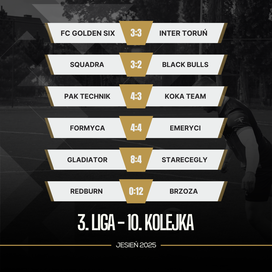 Na zakończenie kolejki byliśmy świadkami prawdziwego pogromu. Redburn Kamlex, który rozegrał całe spotkanie w zaledwie sześcioosobowym składzie, nie był w stanie przeciwstawić się rozpędzonej Brzozie Toruńskiej, przegrywając aż 0:12. Goście dominowali od pierwszej do ostatniej minuty, a prawdziwy koncert zagrał Jerzy Pawłowski – sześć bramek i trzy asysty mówią same za siebie. Zwycięstwo to ogromny krok Brzozy w kierunku utrzymania i walki o grupę centralną. Redburn mimo wysokiej porażki zasługuje jednak na słowa uznania – mimo braków kadrowych, pojawił się na boisku i walczył do samego końca o jak najniższy wymiar kary.