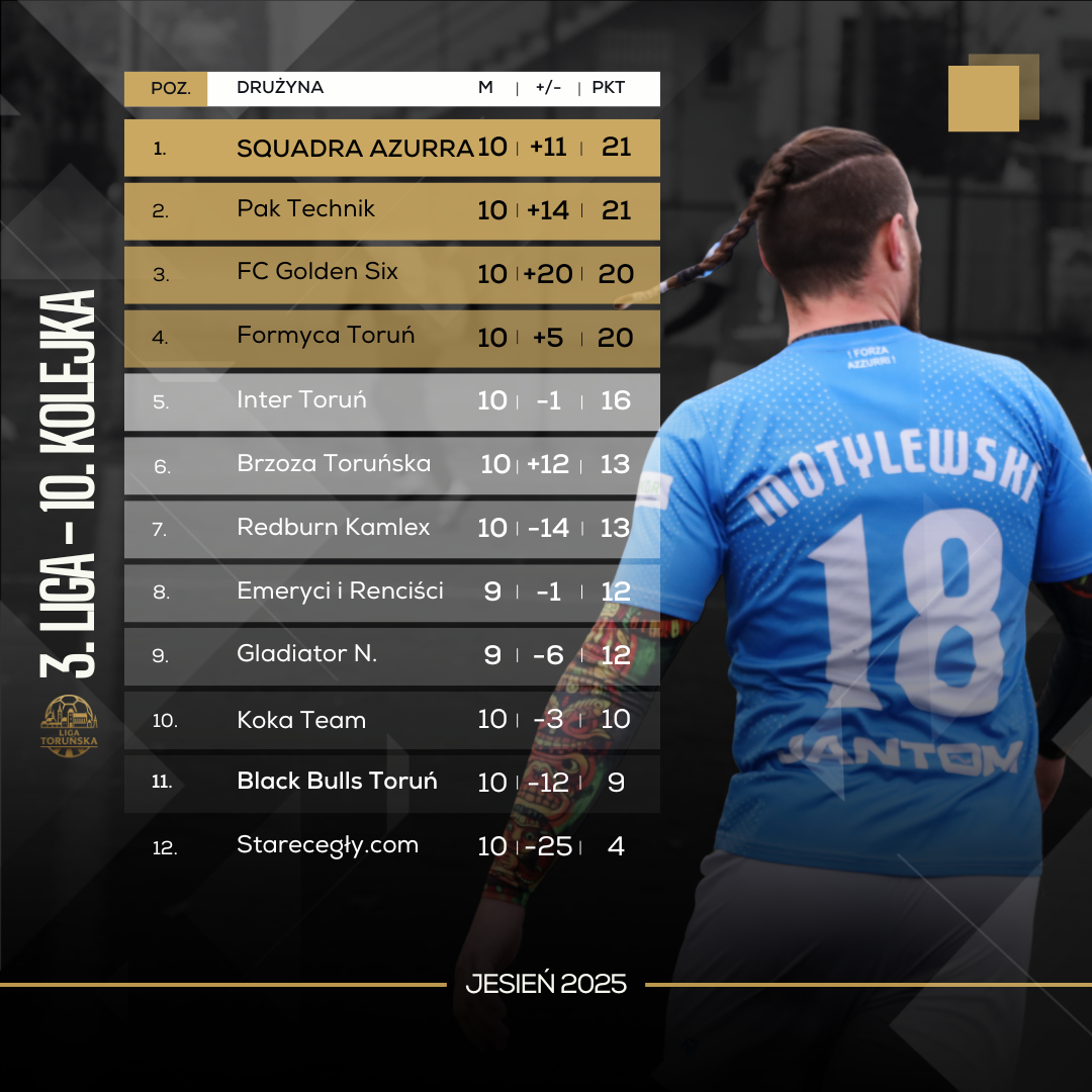 Pak Technik, Squadra Azzurra, FC Golden Six i Formyca Toruń – te cztery drużyny w minionej kolejce przypieczętowały awans do grupy mistrzowskiej i powalczą o końcowy triumf w rozgrywkach. Wciąż jednak otwarta pozostaje kwestia składów grupy centralnej i spadkowej – tam emocje sięgają zenitu, a o losach wielu zespołów zadecyduje dopiero ostatnia kolejka sezonu zasadniczego.