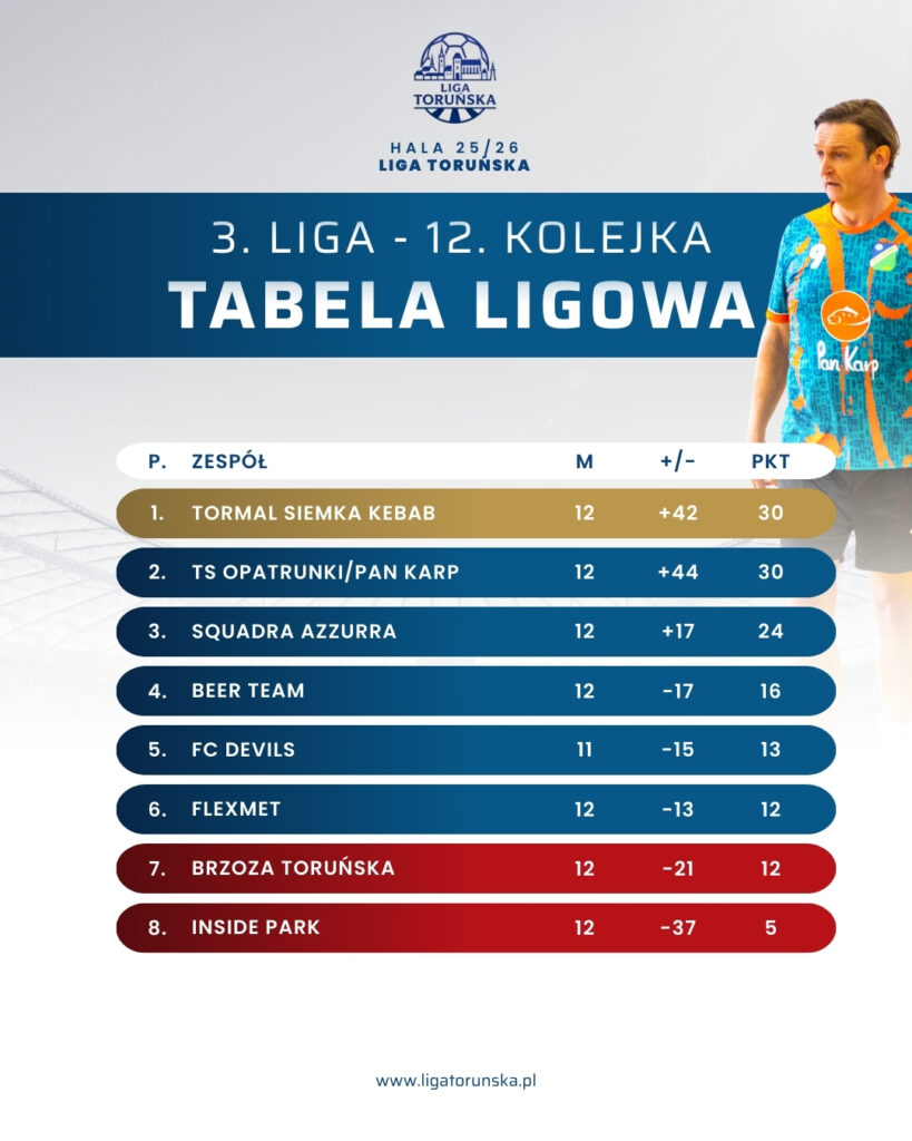 Brzoza Toruńska przegrała z TS Opatrunki/Pan Karp 5:6 w nerwowym i wyrównanym meczu. Opatrunki musiały wygrać i zrobiły to minimalnie, pokazując odporność psychiczną w kluczowych momentach. Artur Żero został MVP spotkania, jego praca w defensywie i na rozegraniu miała bezpośredni wpływ na wynik. Opatrunki mają tyle samo punktów co Tormal i wciąż realne szanse na mistrzostwo. Końcówka sezonu zapowiada się bezpośrednim pojedynkiem nerwów między dwoma najmocniejszymi zespołami ligi.