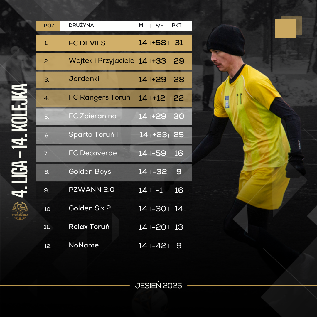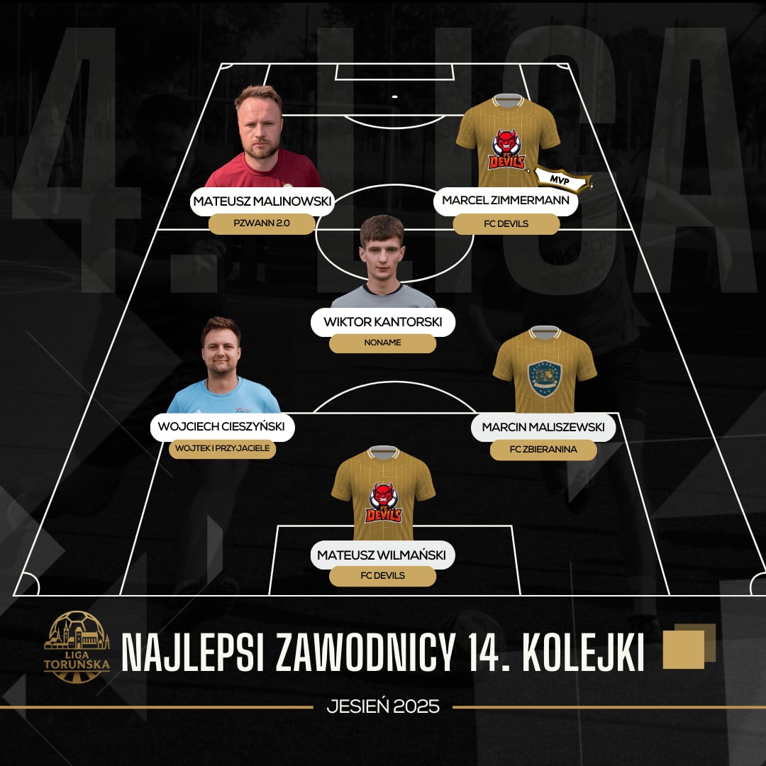 Wielkie emocje towarzyszyły ostatecznym rozstrzygnięciom w grupie mistrzowskiej 4. ligi. Na pierwszy ogień poszło starcie FC Devils z Jordankami. Stawka była ogromna, bowiem wygrany tego meczu zgarniał mistrzostwo. Od samego początku dominowali FC Devils, którzy potrafili to pokazać także w zdobywanych bramkach. W pewnym momencie wyszli na komfortowe 2:0, a ze strony Jordanek nie płynęło większe zagrożenie. W końcówce zaczęło dziać się nieco więcej – chwila dekoncentracji sprawiła, że ekipa Stanisława Briegmanna strzeliła gola kontaktowego. Ostatnie słowo należało jednak do FC Devils i ich bezsprzecznego lidera – Marcela Zimmermanna. Ustalił on wynik meczu na 3:1, a to oznaczało jedno – mistrzostwo dla FC Devils! Po tym meczu kolejną niewiadomą było to, komu przypadnie srebro. Jordanki utrzymałyby się na drugim stopniu podium, gdyby Wojtek i Przyjaciele nie pokonali FC Rangers Toruń. Łatwo nie było, bowiem zespół Wiktora Kozłowskiego postawił bardzo trudne warunki i wcale nie zamierzał oddać swoim rywalom ligowego srebra. Końcowy rezultat okazał się jednak szczęśliwy dla *Wójtków”. Podziękować mogą przede wszystkim Wojciechowi Cieszyńskiemu, który to zgromadził najlepsze statystyki w meczu i poprowadził swoją ekipę do wygranej. Znalazł się on w szóstce kolejki, podobnie zresztą jak dwaj gracze FC Devils – Marcel Zimmermann i Mateusz Wilmański.