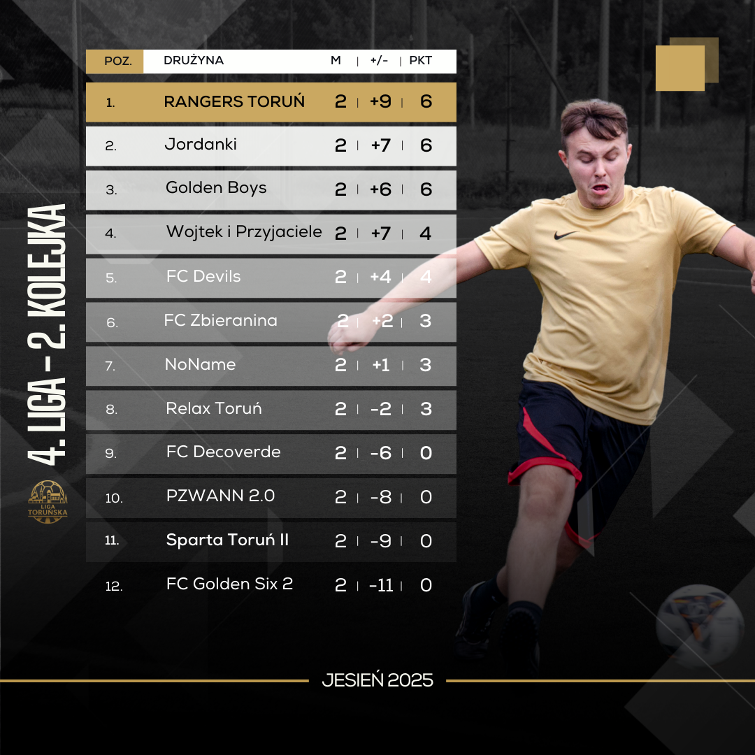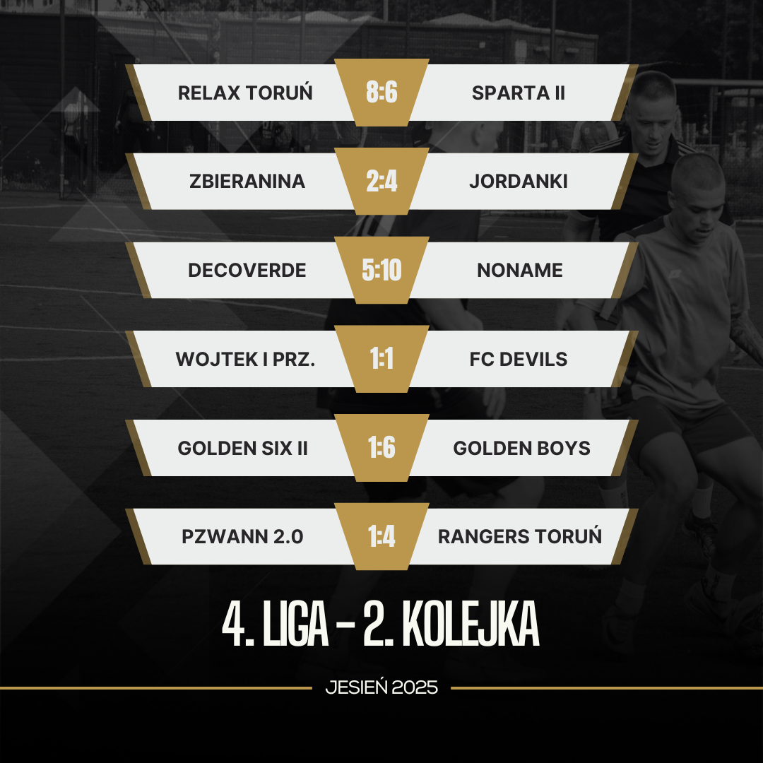 Piękny sen FC Rangers trwa, notując drugie z rzędu pewne zwycięstwo. Kroku dotrzymują im tylko Jordanki i Golden Boys. Ligowy hit na remis. Bolesne wejście do 4. Ligi FC Decoverde, którzy zamykają tabelę wraz ze Spartą Toruń II. Ta pokonana została przez Relax Toruń.