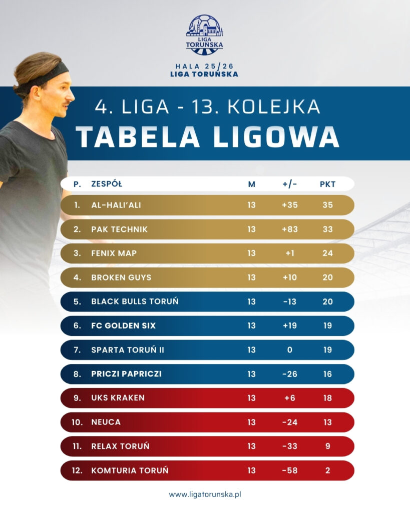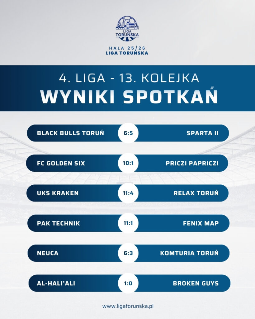 Trzynasta kolejka 4. Ligi wyraźnie ustawiła końcówkę sezonu. Najważniejsze rozstrzygnięcia zapadły w grupie mistrzowskiej – PAK Technik oraz Al-Hali’Ali wygrały swoje mecze i w ostatniej kolejce zmierzą się w bezpośrednim pojedynku o mistrzostwo. Wiadomo już także, że Fenix Map zakończy sezon z brązowymi medalami, ponieważ po porażce z Al-Hali’Ali drużyna Broken Guys straciła matematyczne szanse na podium.