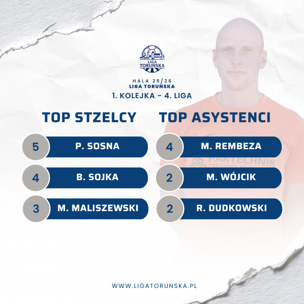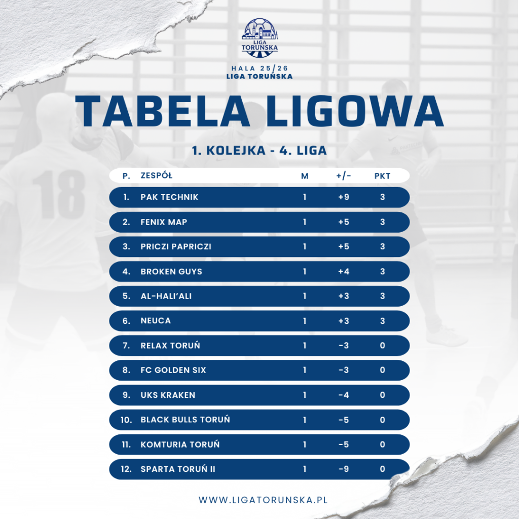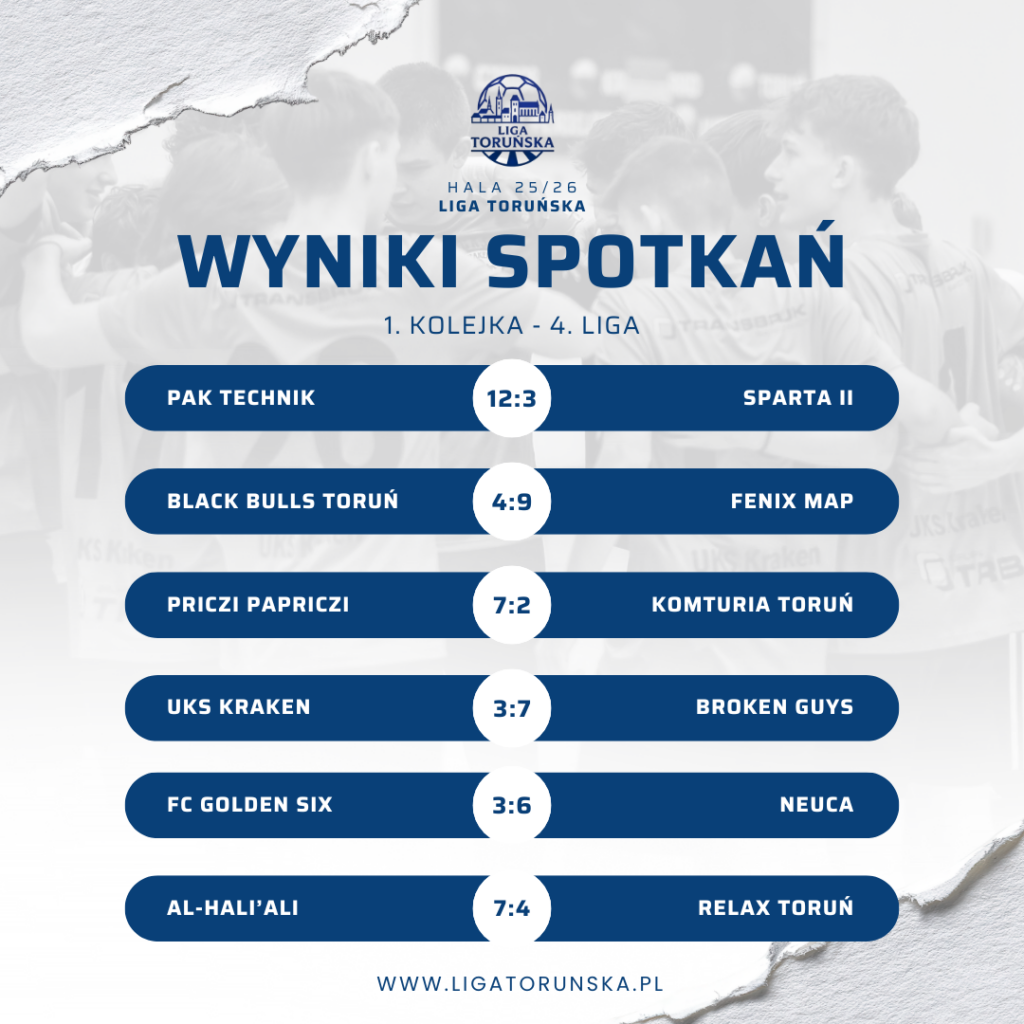 Inauguracyjne spotkanie rozgrywek halowych przyniosło aż piętnaście bramek. Pak Technik rozbił Spartę Toruń II 12:3 i już na początku sezonu pokazał potencjał drużyny aspirującej do walki o medale. Sparta próbowała nawiązać równorzędną rywalizację do około 15. minuty, jednak z każdą kolejną minutą przewaga PAK Techniku była coraz wyraźniejsza. Piotr Sosna zdobył w tym meczu aż pięć bramek i dołożył asystę, co dało mu tytuł MVP spotkania oraz całej kolejki w 4. lidze.