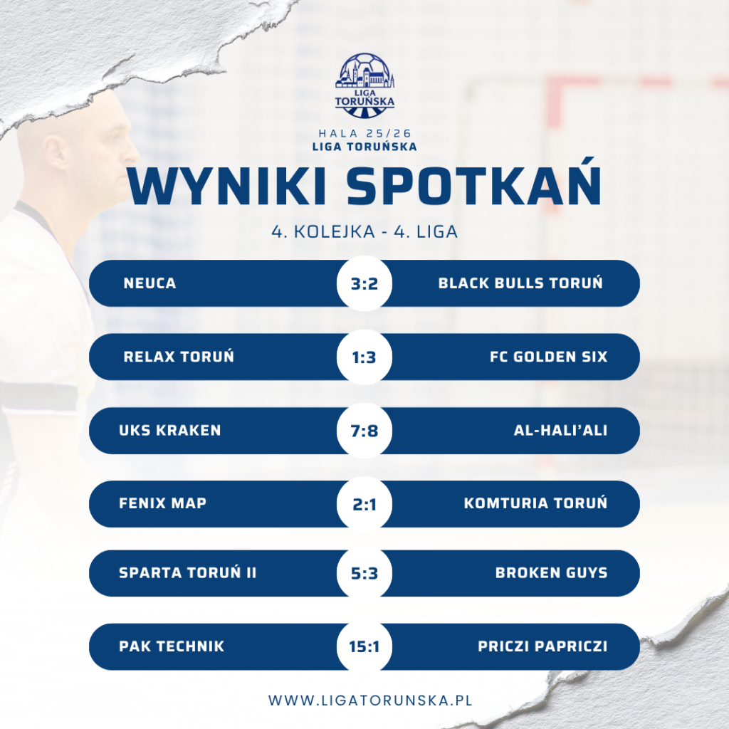 Czwarta kolejka halowej 4. ligi dostarczyła pełnego wachlarza emocji – od zaciętych końcówek, przez mecze bramkarzy, aż po prawdziwe demolki. Były pierwsze zwycięstwa, odwrócone losy spotkań i widowisko, które na długo zostanie w pamięci kibiców zgromadzonych w IV LO.