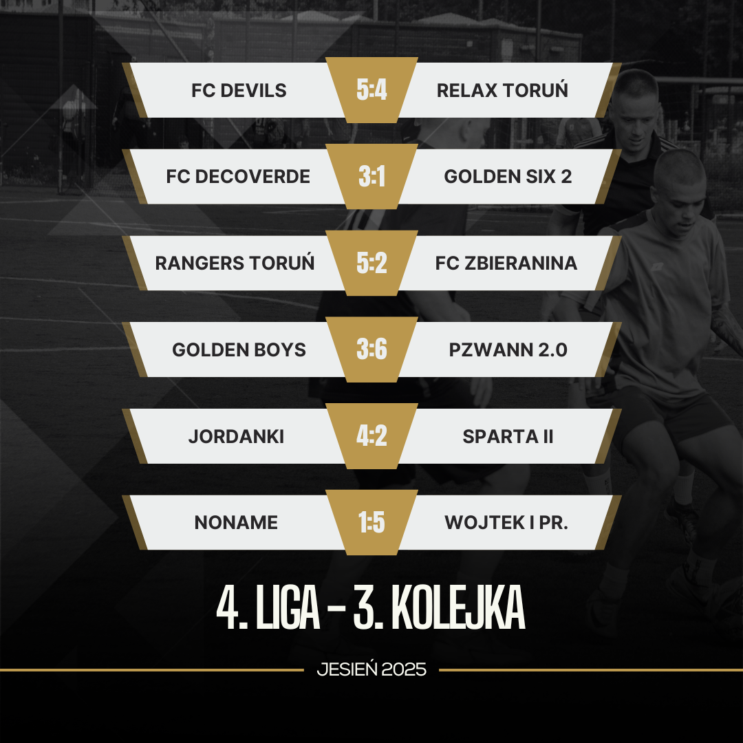 Weekend w 4. Lidze rozpoczął się od meczu, który był bardziej zacięty, niż można było się przed jego rozpoczęciem spodziewać. FC Devils mieli wygrać z Relax Toruń gładko i przyjemnie, a tymczasem wynik rywalizacji był niepewny do ostatnich minut. Koniec końców górą był faworyt, jednak różnicą zaledwie jednego gola i ze sporą dawką emocji przeżytych przed końcowym gwizdkiem. W tych okolicznościach najlepiej odnalazł się Radosław Szynal, który maczał palce w trzech z pięciu goli swojej ekipy i trafił za to do szóstki kolejki.