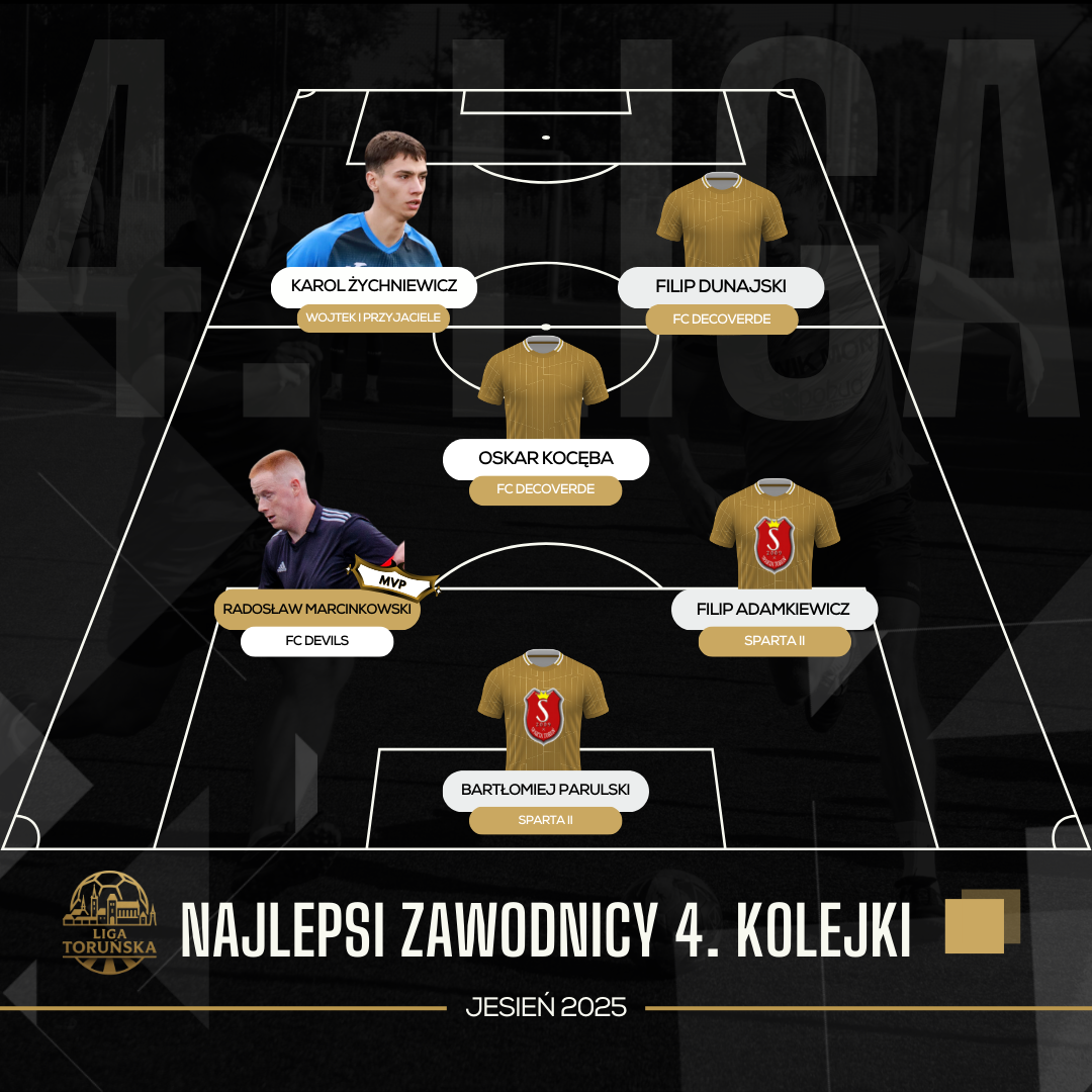 Wobec porażki dotychczasowego lidera, na czoło 4. Ligi wskoczyły zespoły FC Devils oraz Wojtek i Przyjaciele. Pierwsi ograli Jordanki, a prawdziwy koncert rozegrał Radosław Marcinkowski. Jego trzy bramki i asysta oznaczają, że brał udział w czterech z sześciu strzelonych przez zespół goli. Przeciwnicy nie mieli na niego odpowiedzi. Z kolei Wojtek i Przyjaciele nie dali większych szans ekipie Relax Toruń. Ekipa Sebastiana Kaźmierczaka pozwoliła rywalowi na pojedyncze zrywy w ataku, samemu punktując go raz za razem. Skończyło się na ośmiu golach i miejscu w szóstce kolejki dla Karola Żychniewicza. Nie mogło być inaczej, bowiem strzelił on połowę z nich wszystkich.