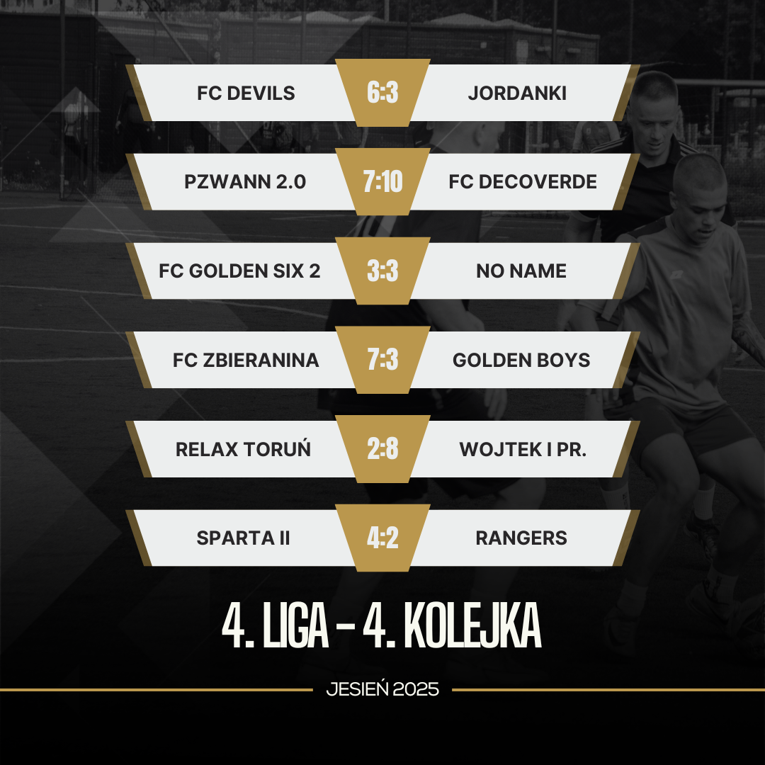 Pierwsze zwycięstwo Sparty jest jednocześnie pierwszą porażką Rangers. Wojtek i Przyjaciele oraz FC Devils nowymi liderami tabeli. FC Golden Six 2 z remisem, czyli nie ma już w 4. Lidze drużyny bez choćby punktów. FC Decoverde i FC Zbieranina z trzema oczkami na koncie.