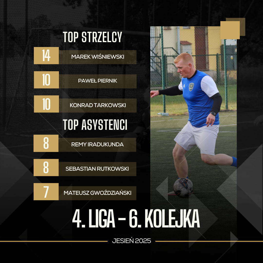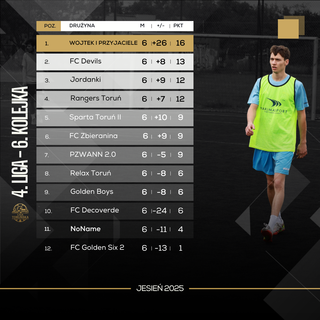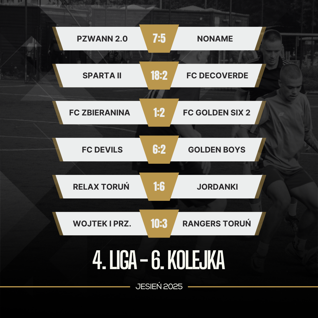 Choć starcie FC Rangers Toruń z ekipą Wojtek i Przyjaciele zamykało 6. serię gier w 4. Lidze, to jednak od niego sobie zaczniemy, bowiem był to bardzo ważny mecz w kontekście walki o najwyższe lokaty. Przed rozpoczęciem starcia obie ekipy dzielił zaledwie punkt, jednak po jego zakończeniu przewaga “Wojtków” urosła do czterech oczek. Zwycięstwo drużyny Sebastiana Kaźmierczaka było pewne, wysokie i zasłużone. Tym samym Wojtek i Przyjaciele umocnili się na pozycji lidera, zaś FC Rangers spadli tuż za podium. Dodatkowo do szóstki kolejki z tytułem MVP całej serii gier trafił Karol Żychniewicz.