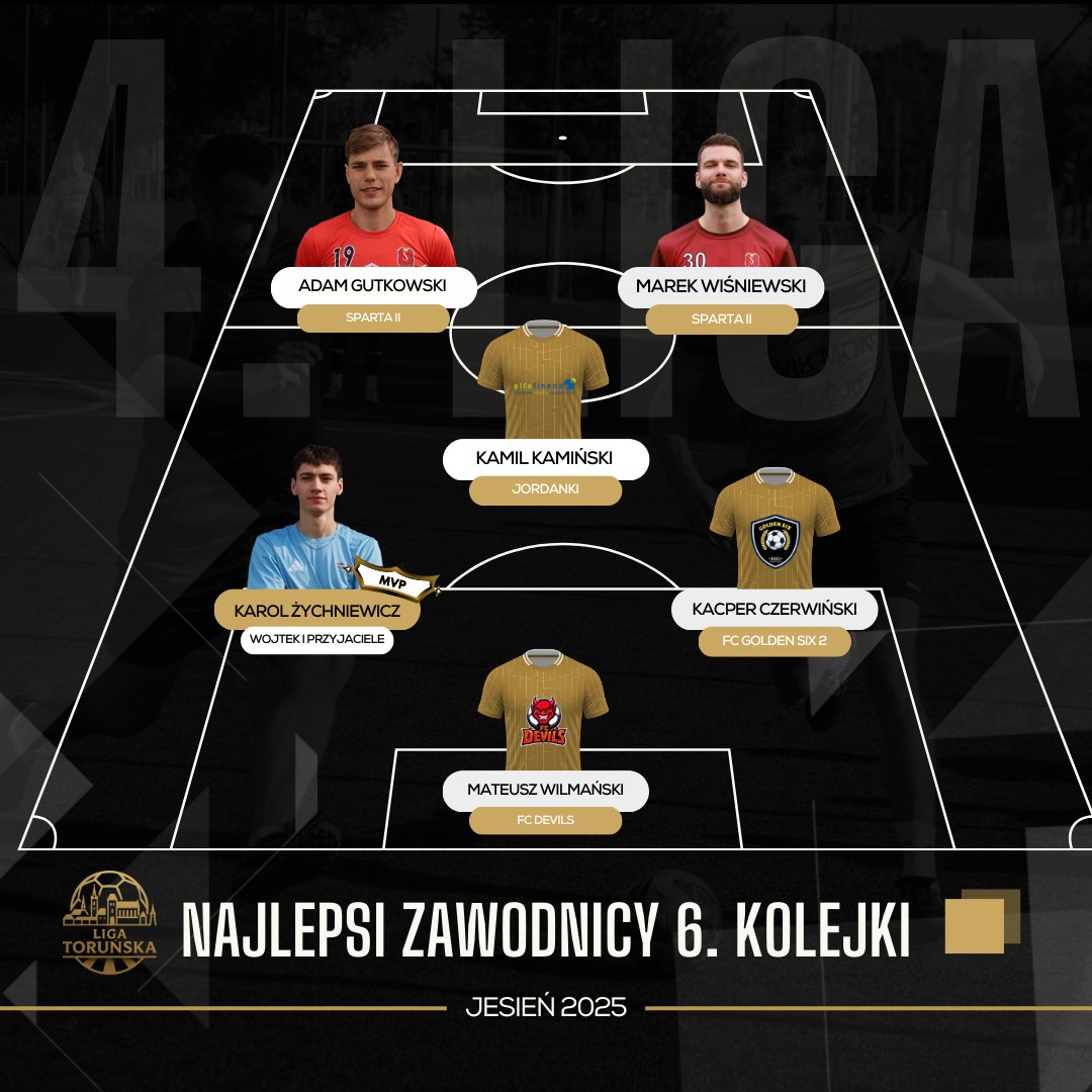 Na sam koniec meczu Sparty Toruń II z FC Decoverde, który zapowiadał się jak bardzo ciekawy, a zakończył niespodziewanie wysokim zwycięstwem tych pierwszych. Prawdziwy koncert na cztery ręc… nogi rozegrali napastnicy, Adam Gutkowski i Marek Wiśniewski. Pierwszy z nich zaliczył pięć goli i sześć asyst, drugi zaś trafił do siatki aż ośmiokrotnie, dorzucając dwa ostatnie podania. Takie osiągnięcia musiały zostać docenione miejscem w szóstce kolejki. Sparta w pełni wykorzystała fakt, że rywale przyszli na mecz bez zmienników, a przede wszystkim bez liderów drużyny. To jednak nie był ich problem. Problem mieć za to mogą kolejne drużyny, któe rozegrają mecz ze Spartą, gdyż ta wyraźnie z każdym tygodniem się rozpędza.