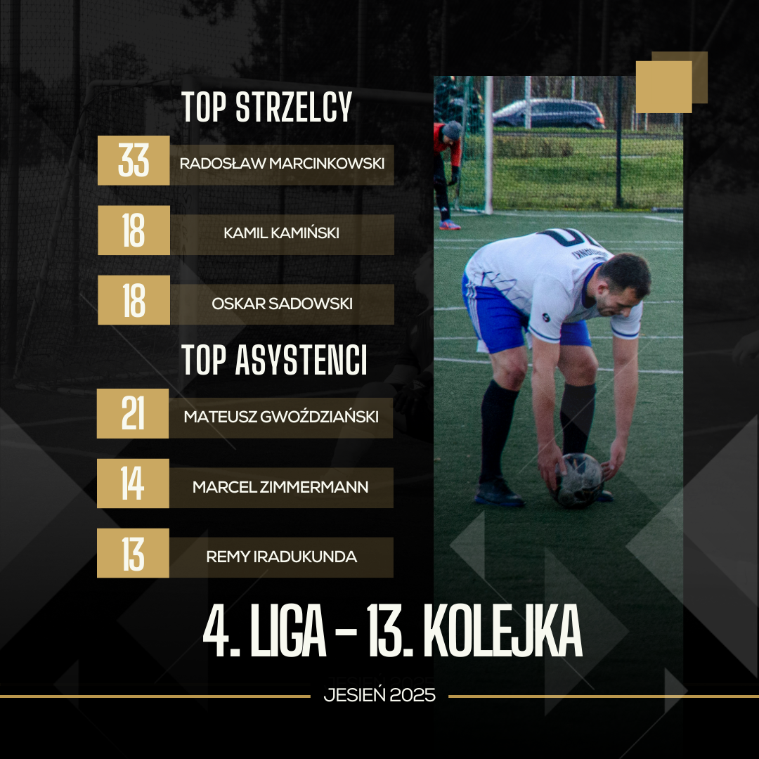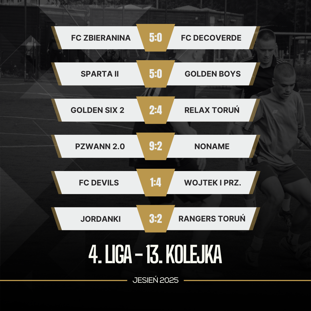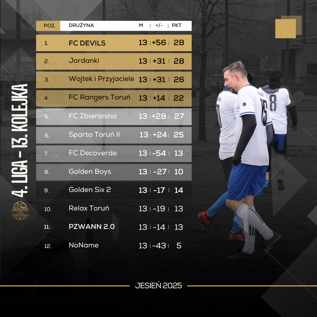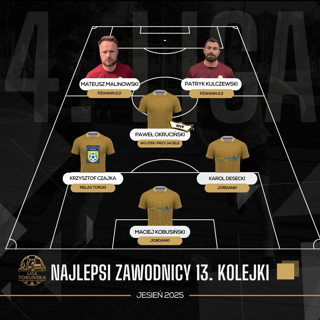 Relax Toruń nieźle namieszał w grupie spadkowej – ekipa ta ma na koncie póki co dwa zwycięstwa i może być pewna, że jeśli w ostatnim meczu pokona NoName, to utrzyma się w 4. Lidze na kolejny sezon. W 13. kolejce udało im się ograć FC Golden Six 2, choć mecz był bardzo wyrównany i mógł pójść w obie strony. Widać było jednak, że Relax Toruń był “na musiku”, zaś Goldeni mogli sobie pozwolić na jeszcze jedną wpadkę. W drugim meczu nie było niespodzianki – PZWANN 2.0 pewnie ograł NoName, oficjalnie zrzucając rywala do niższej ligi. Mecz od pierwszego do ostatniego gwizdka pod dyktando faworyta, który dodatkowo ulokował w szóstce kolejki dwóch swoich przedstawicieli – Mateusza Malinowskiego i Patryka Kulczewskiego. Z ekipy Relax Toruń wśród najlepszych graczy 13. kolejki znalazł się Krzysztof Czajka.