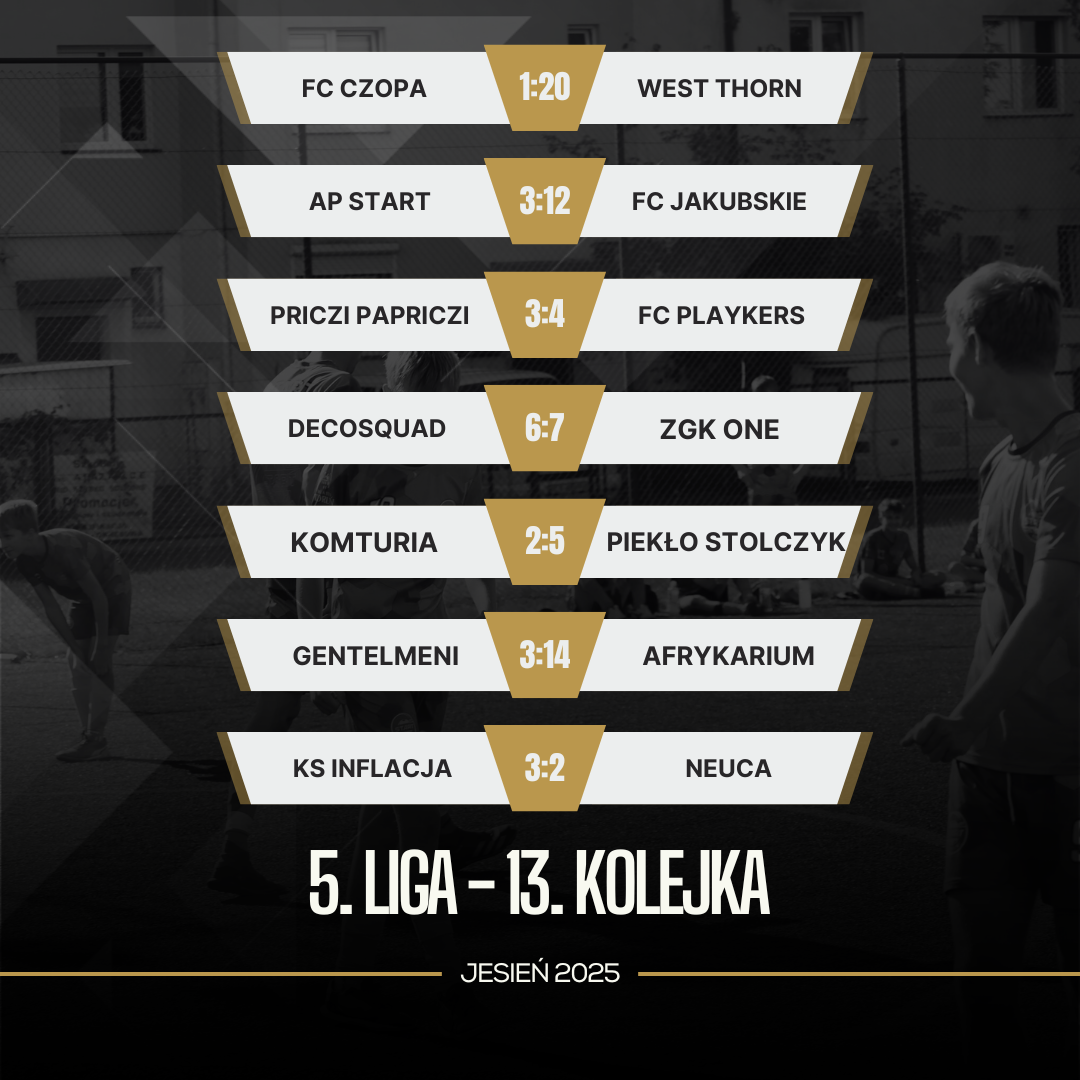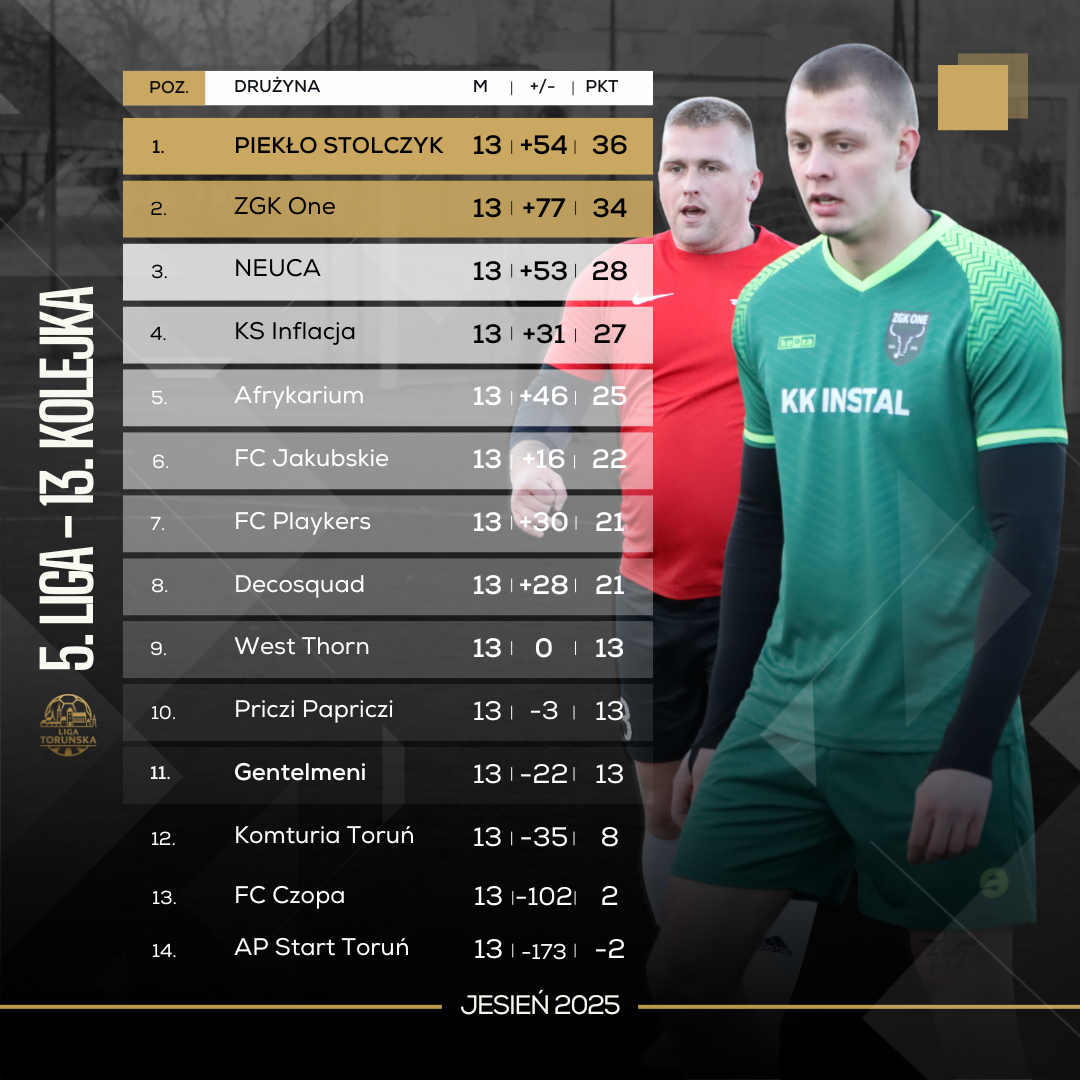 Najważniejsze wydarzenia ostatniego weekendu w 5. Lidze? Mistrzostwo dla Piekło Stolczyk, drugie miejsce dla ZGK One, zero walkowerów w 13., mroźnej kolejce. To może cieszyć, gdyż doświadczenie nauczyło, że niekiedy w podobnej sytuacji więcej meczów się nie odbywa, aniżeli odbywa.