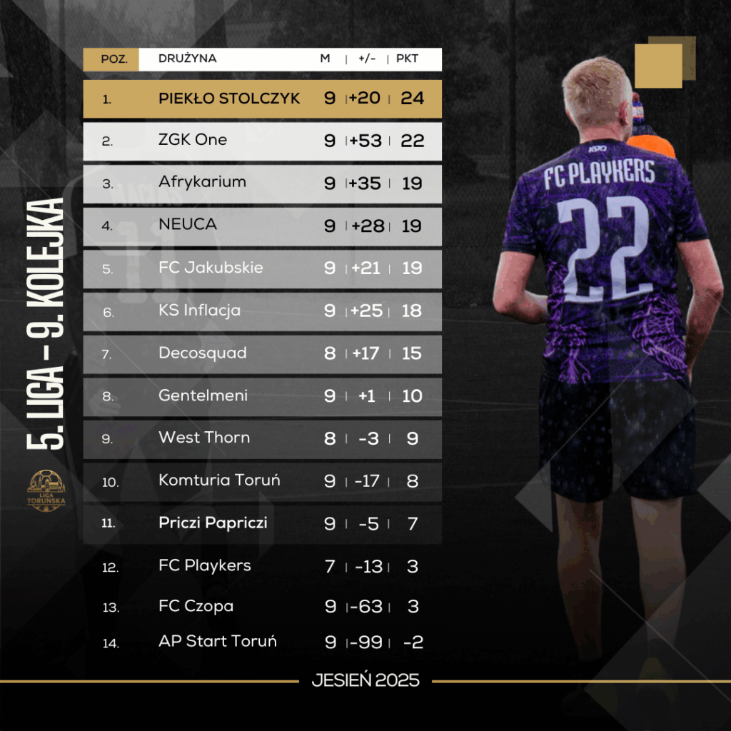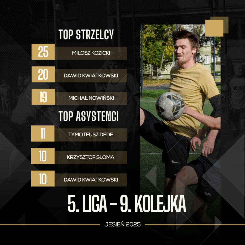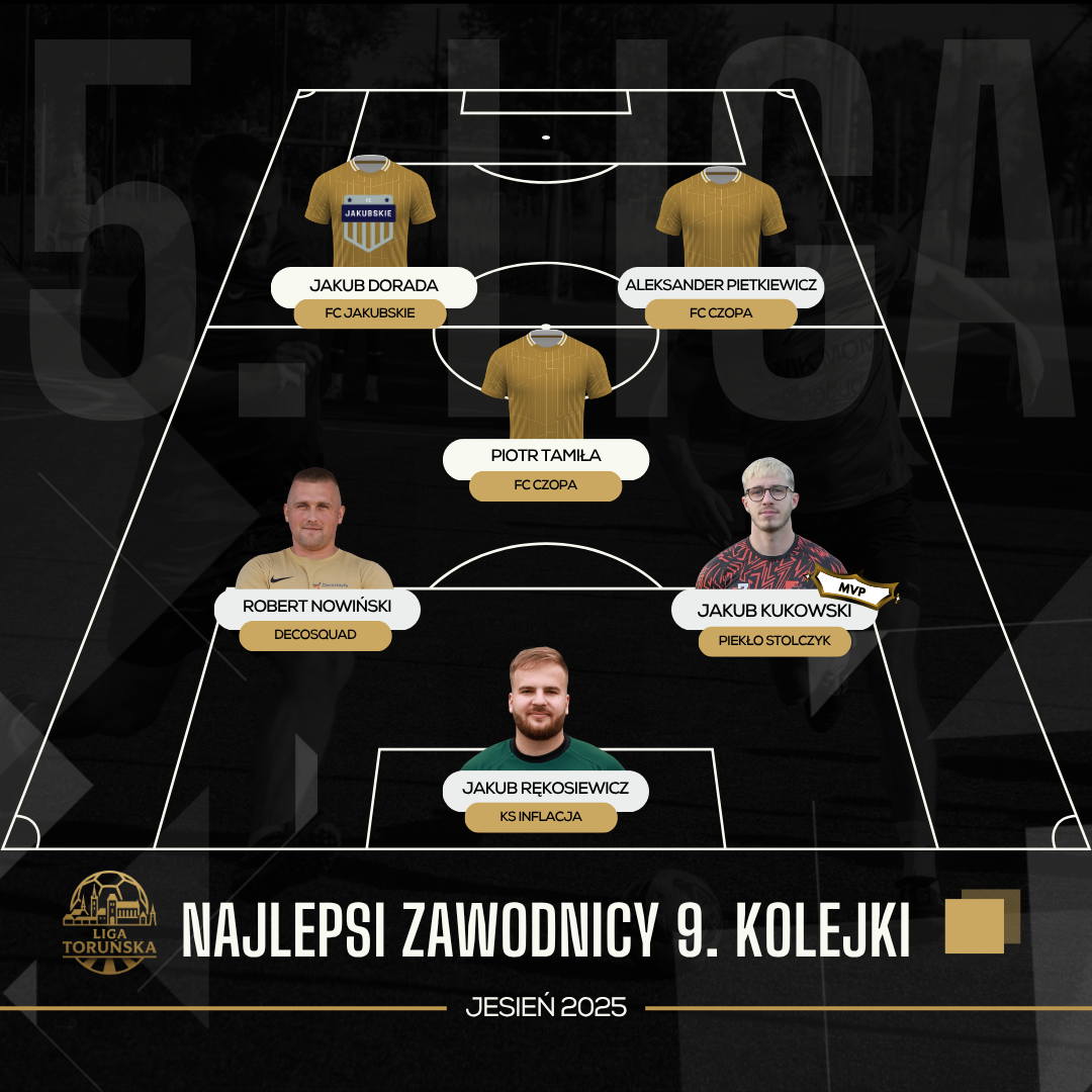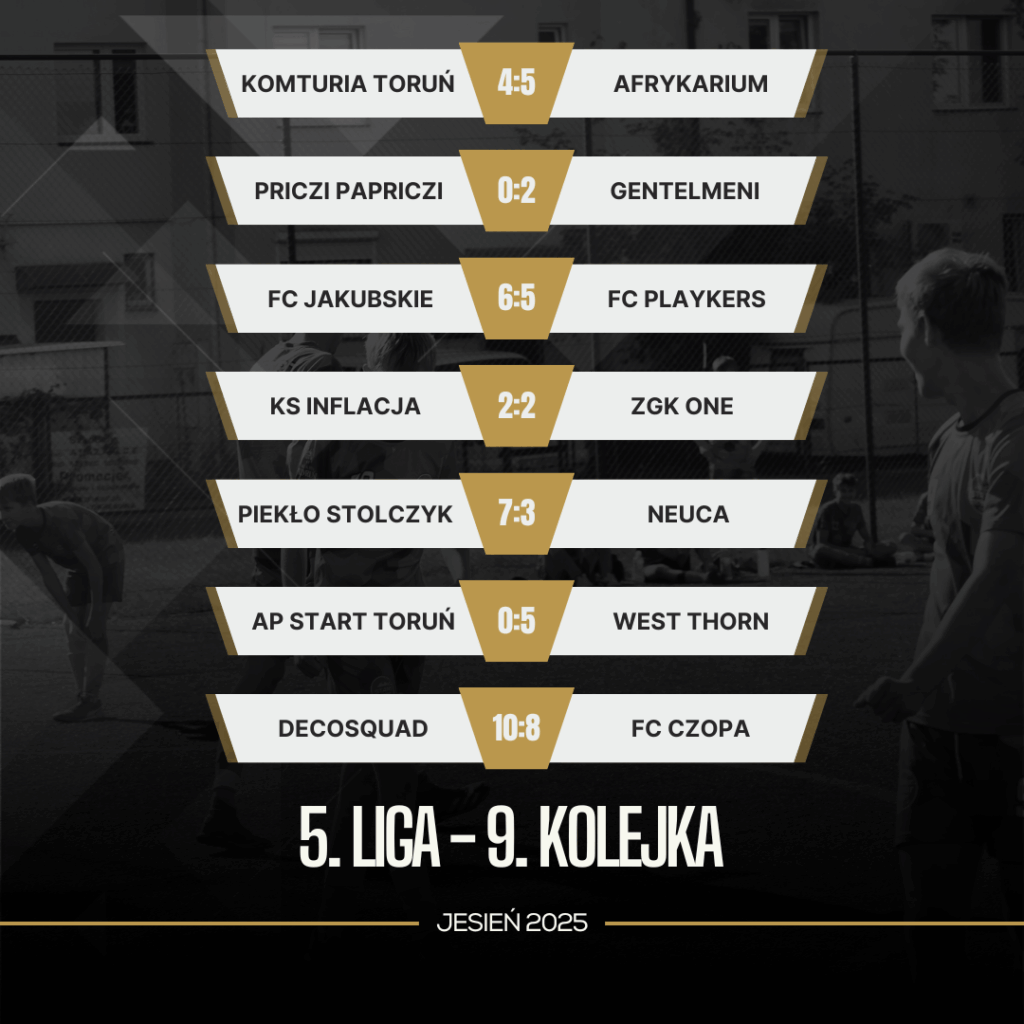 Najważniejszym wynikiem w 9. kolejce w 5. Lidze był podział punktów w meczu między ZGK One, a KS Inflacją. Sprawił on, że samodzielnym liderem tabeli ponownie zostało Piekło Stolczyk. Drużyna Dawida Sobolewskiego nie miała kłopotów z ograniem Neuki, a patrząc na terminarz, mają autostradę do mistrzostwa – choć nie bez kilku wybojów po drodze. ZGK One w meczu z Inflacją przeważało, jednak wszelkie próby kończyły się nieskutecznie – głównie dzięki postawie Jakuba Rękosiewicza w bramce. Trafił on do szóstki kolejki, podobnie jak Jakub Kukowski z Piekło Stolczyk, który był głównym architektem wygranej swojej drużyny. Neuca nie miała na niego sposobu, o czym świadczy strzelony hat-trick.