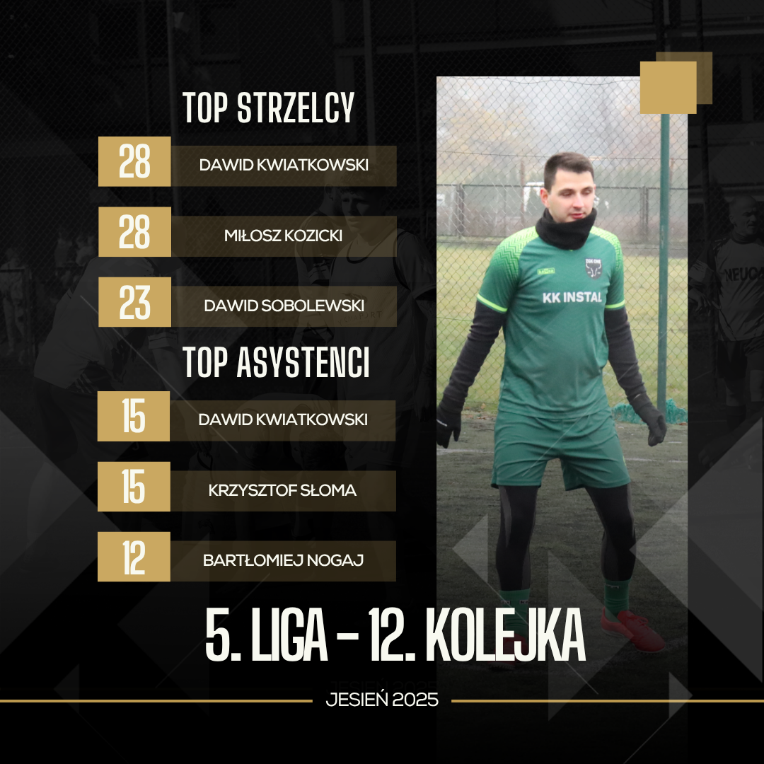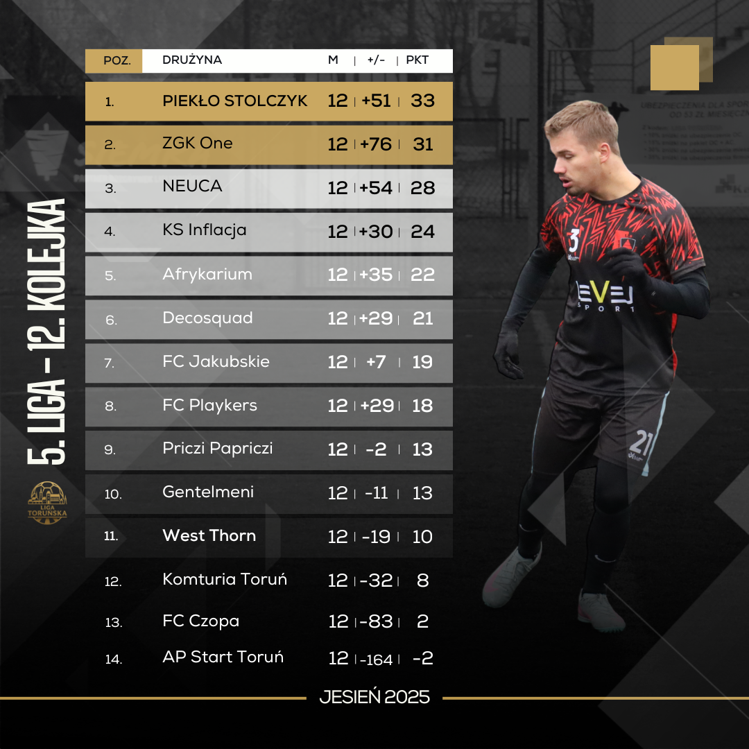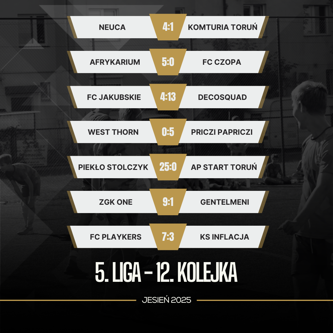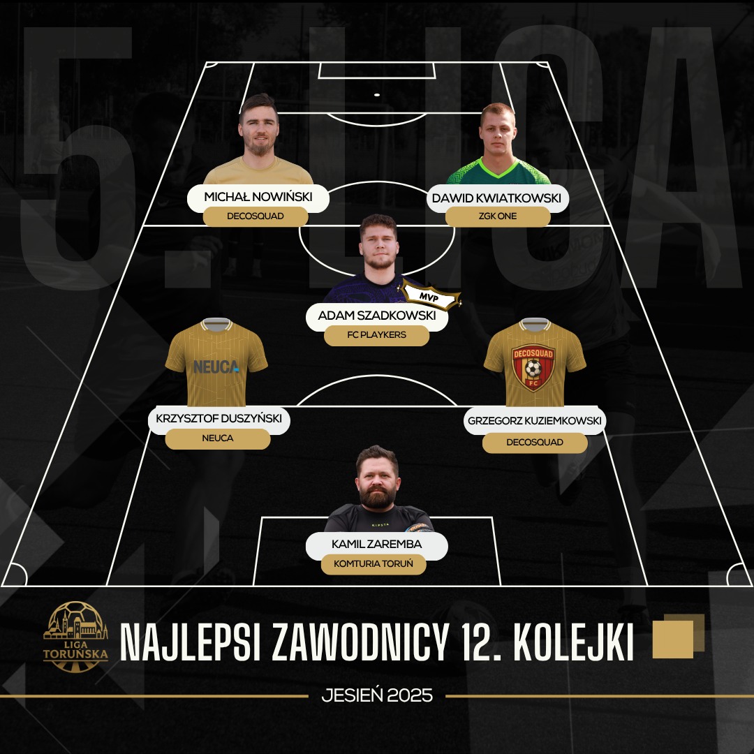 Neuca z brązowymi medalami – to już oficjalna informacja. Ekipa Daniela Ochnickiego na początku wzorowo wykonała swoje zadanie, ogrywając Komturię. Mecz ten nie przebiegał do końca po myśli faworyta, który gola na 2:1 zdobył dopiero w 43. minucie. Wcześniej powstrzymywał ich udanymi interwencjami bramkarz rywali, Kamil Zaremba. Liczy się jednak to, że w końcówce potrafili przechylić szalę zwycięstwa na swoją korzyść. Neuca wygrała i musiała czekać na to, co zrobi KS Inflacja. Zespół Patryka Piechoty mierzył się z FC Playkers i tego egzaminu nie zdał. Robił co mógł Miłosz Kozicki, zdobywając hat-tricka, jednak on i jego koledzy z drużyny nie mieli recepty na zatrzymanie Adama Szadkowskiego. Najlepszy strzelec FC Playkers zdobył trzy gole, dorzucił asystę, a za swój występ doceniony został mianem najlepszego zawodnika 12. kolejki w 5. Lidze. Wraz z nim do szóstki kolejki trafili Krzysztof Duszyński (Neuca) oraz Kamil Zaremba (Komturia Toruń).