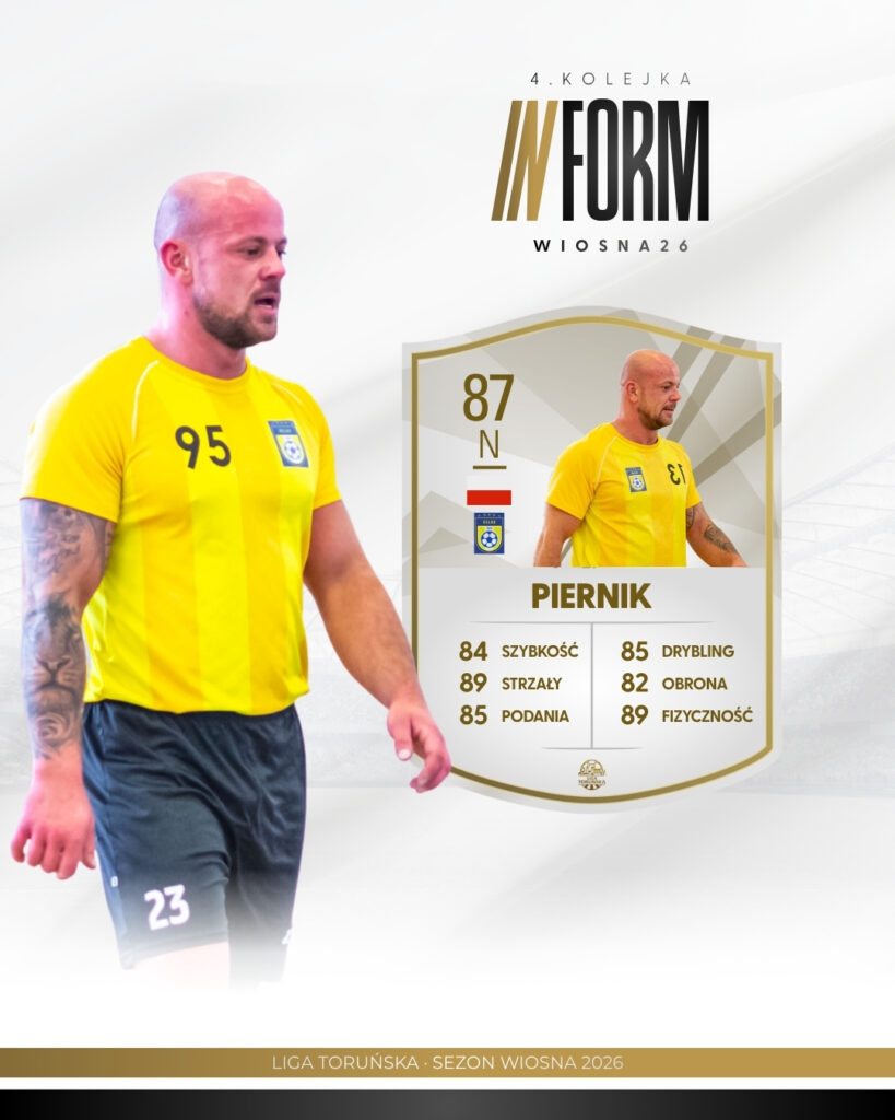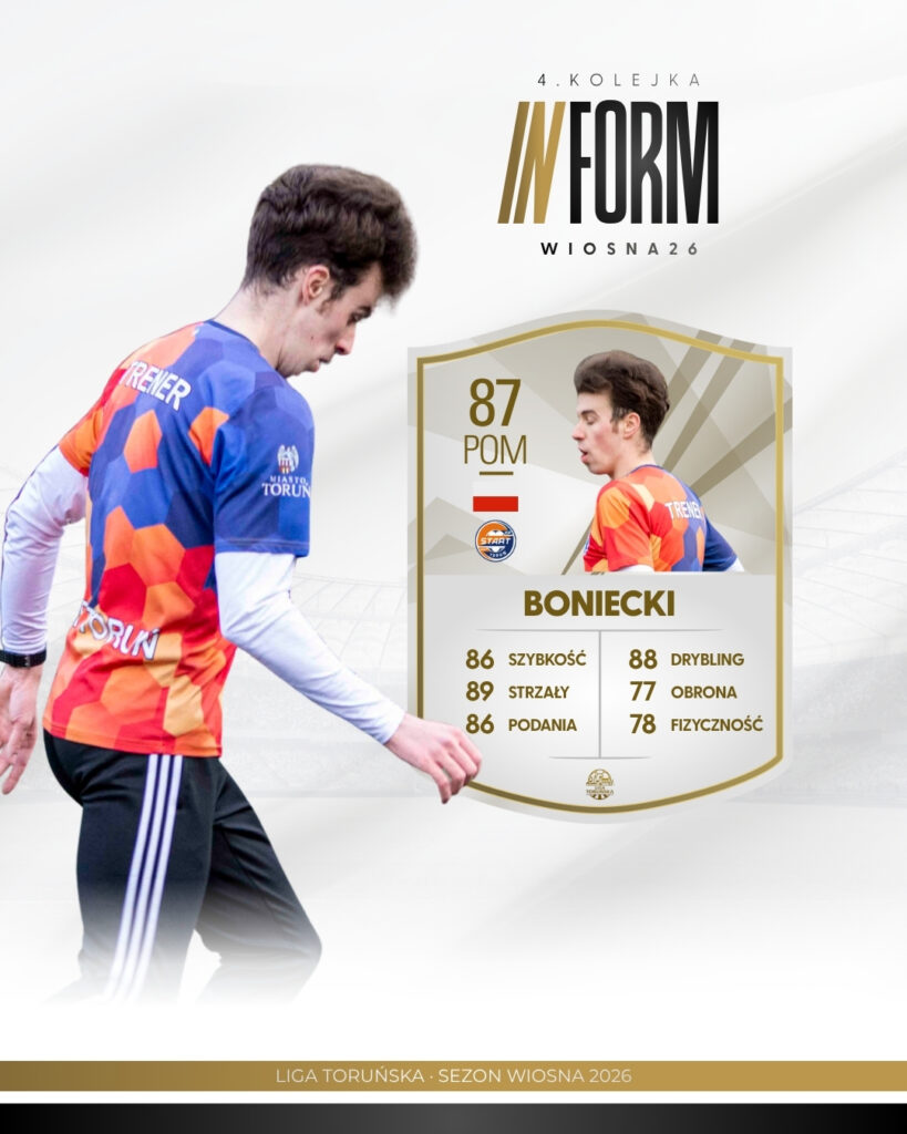 Na deser zostaje nam postać Mateusza Bonieckiego. Akademia Piłkarska Start Toruń doczekała się swojego pierwszego, historycznego zwycięstwa, a jego głównym architektem był właśnie Boniecki. Trzy bramki i dwie asysty to bilans, którym Mateusz dał sygnał swoim podopiecznym, że determinacja i spokój pod bramką są kluczem do sukcesu. To zwycięstwo ma wymiar symboliczny dla całej akademii, a Boniecki w roli egzekutora pokazał, że potrafi prowadzić zespół do celu nie tylko z ławki, ale przede wszystkim z samego boiska.
