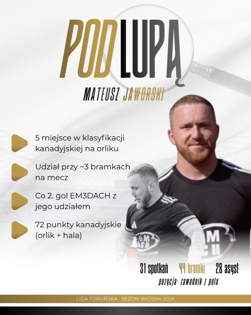 Analiza „Pod Lupą” pokazuje jasno – Mateusz Jaworski to nie tylko skuteczny napastnik, ale kompletny zawodnik ofensywny. Łączy gole, asysty, wpływ na tempo gry i regularność z realnym przełożeniem na wyniki EM3DACH. Gdy jeden zawodnik odpowiada za niemal połowę dorobku bramkowego drużyny, nie można mówić o przypadku, a o systematycznej dominacji.