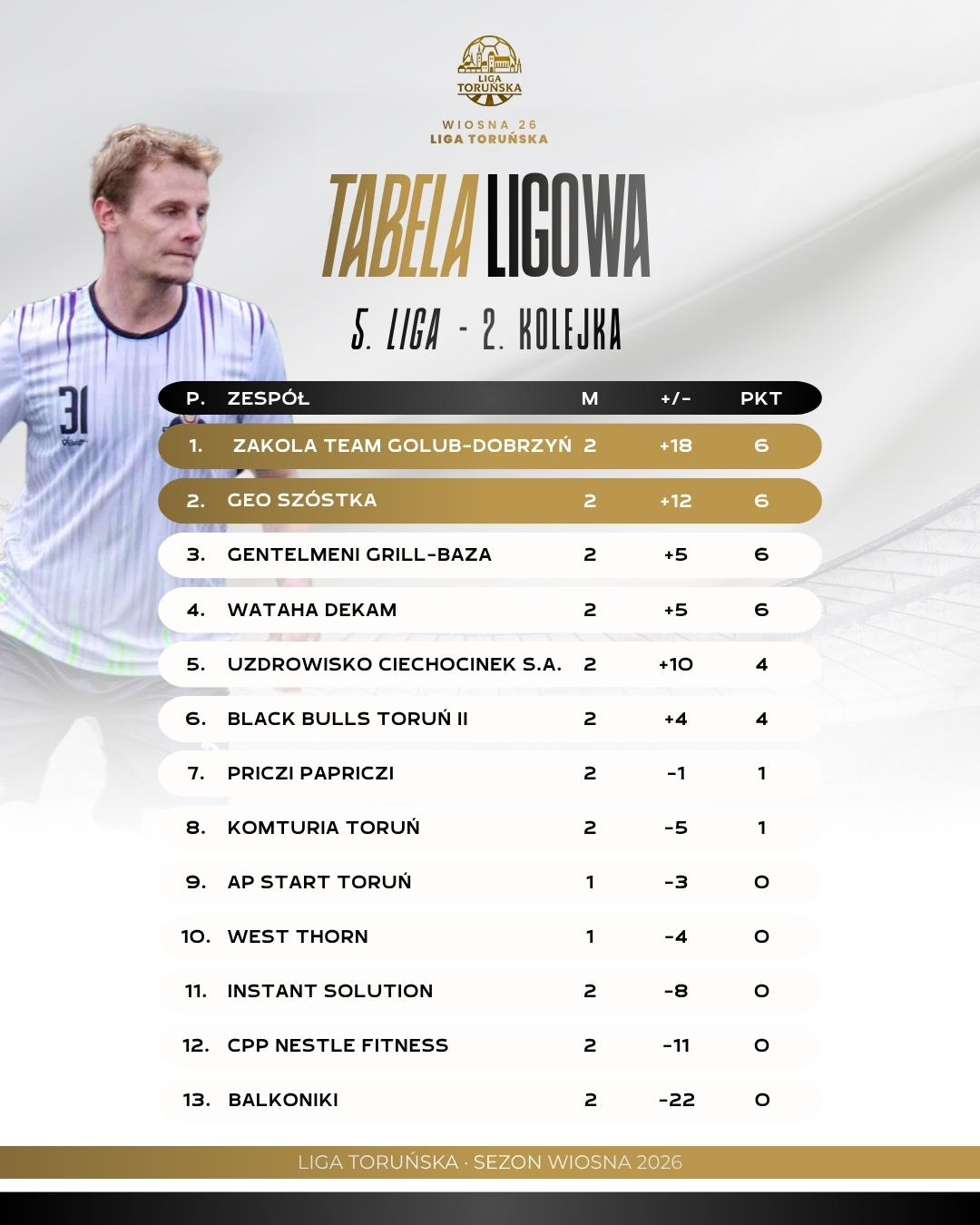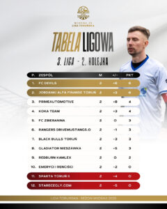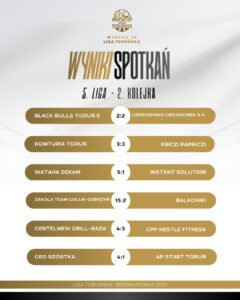 Największym wydarzeniem kolejki była absolutna dominacja PZWANN, które rozbiło Rozbujanych aż 9:0 i po dwóch kolejkach sensacyjnie objęło prowadzenie w tabeli. Zespół Marcina Niedzielskiego najpierw pokonał Team UA, a teraz całkowicie zdominował kolejnego rywala, potwierdzając, że jest jednym z najgroźniejszych zespołów na początku sezonu. W starciu beniaminków Pak Technik potwierdził swoją jakość i wygrał ze Squadrą Azzurra 5:2, a najlepszym zawodnikiem spotkania został Sebastian Lewandowski, który miał ogromny wpływ na przebieg meczu i był liderem swojej drużyny w kluczowych momentach. Galacticos Lizard King Toruń również dopisali komplet punktów, pokonując Formycę Toruń 4:2 i utrzymując kontakt z czołówką tabeli. Ich rywale zaprezentowali się ambitnie, jednak ponownie zabrakło im skuteczności i konkretów w decydujących momentach. Warto odnotować, że spotkanie Młodych Emerytów NordGips z Team UA zostało przełożone.