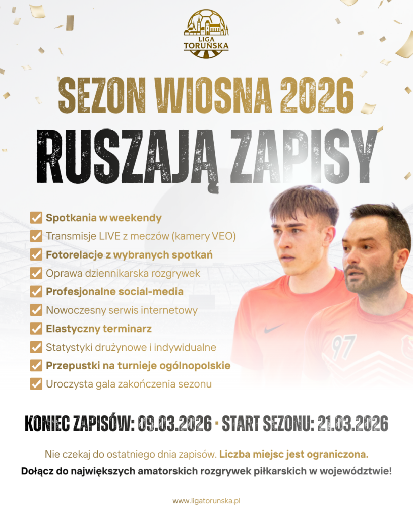 Z ogromną przyjemnością ogłaszamy otwarcie zapisów do nowego sezonu! Wracamy na boiska już w weekend 21/22 marca 2026. Zbierajcie składy, bo czas ucieka – zapisy trwają tylko do 9 marca!